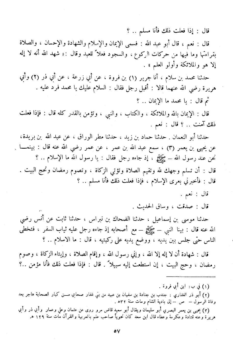 حَدَّثَنَا أَبُو النُّعْمَانِ، حَدَّثَنَا حَمَّادُ بْنُ زَيْدٍ، حَدَّثَنَا مَطَرٌ الْوَرَّاقُ، عَنْ عَبْدِ اللَّهِ بْنِ بُرَيْدَةَ، عَنْ يَحْيَى بْنِ يَعْمَرَ، سَمِعَ عَبْدَ اللَّهِ بْنَ عُمَرَ، عَنْ عُمَرَ رَضِيَ اللَّهُ عَنْهُ، قَالَ: بَيْنَمَا نَحْنُ عِنْدَ رَسُولِ اللَّهِ صَلَّى اللهُ عَلَيْهِ وَسَلَّمَ إِذَا جَاءَهُ رَجُلٌ فَقَالَ: يَا رَسُولَ اللَّهِ §مَا الْإِسْلَامُ؟ قَالَ: «أَنْ تُسْلِمَ وَجْهَكَ لِلِّهِ، وَتُقِيمَ الصَّلَاةَ، وَتُؤتِي الزَّكَاةَ، وَتَصُومَ رَمَضَانَ، وَتَحُجَّ الْبَيْتَ» ، قَالَ: فأَخْبِرْنِي بِعُرَى الْإِسْلَامِ، فَإِذَا فَعَلْتُ ذَلِكَ فَأَنَا مُسْلِمٌ؟ قَالَ: «نَعَمْ» ، قَالَ: صَدَقْتَ وَسَاقَ الْحَدِيثَ