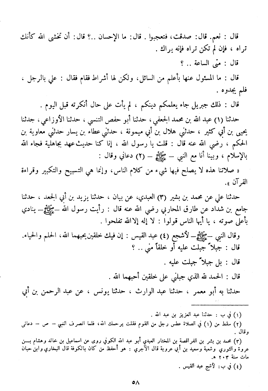 وَقَالَ النَّبِيُّ صَلَّى اللهُ عَلَيْهِ وَسَلَّمَ لِأَشْجَعِ عَبْدِ الْقَيْسِ: «إِنَّ §فِيكَ خُلُقَيْنِ يُحِبُّهُمَا اللَّهُ، الْحِلْمُ وَالْحَيَاءُ» ، قَالَ: جَبْلًا جُبِلْتُ عَلَيْهِ أَوْ خُلُقًا مِنِّي؟ قَالَ: «بَلْ جَبْلًا جُبِلْتَ عَلَيْهِ» قَالَ: الْحَمْدُ لِلِّهِ الَّذِي جَبَلَنِي عَلَى خُلُقَيْنِ أَحَبَّهُمَا اللَّهُ حَدَّثَنَا بِهِ أَبُو مَعْمَرٍ، حَدَّثَنَا عَبْدُ الْوَارِثِ، حَدَّثَنَا يُونُسُ، عَنْ عَبْدِ الرَّحْمَنِ بْنِ أَبِي بَكْرَةَ، عَنْ أَشَجِّ عَبْدِ الْقَيْسِ أَنَّ النَّبِيَّ صَلَّى اللهُ عَلَيْهِ وَسَلَّمَ قَالَ لَهُ ذَلِكَ وَزَادَ، قُلْتُ: قَدِيمًا كَانَ أَوْ حَدِيثًا؟ قَالَ: «قَدِيمًا» -[59]-، حَدَّثَنَا عَمْرُو بْنُ زُرَارَةَ، حَدَّثَنَا إِسْمَاعِيلُ، عَنْ يُونُسَ، زَعَمَ عَبْدُ الرَّحْمَنِ بْنُ أَبِي بَكْرَةَ قَالَ: قَالَ أَشَجُّ: قَالَ النَّبِيُّ صَلَّى اللهُ عَلَيْهِ وَسَلَّمَ بِهَذَا قُلْتُ: الْحَمْدُ لِلِّهِ الَّذِي جَبَلَنِي عَلَى خُلُقَيْنِ يُحِبُّهُمَا، حَدَّثَنَا إِسْمَاعِيلُ بْنُ مُوسَى، حَدَّثَنَا هُشَيْمٌ، عَنْ يُونُسَ، عَنْ عَبْدِ الرَّحْمَنِ بْنِ أَبِي بَكْرَةَ، عَنِ الْأَشَجِّ، قَالَ النَّبِيُّ صَلَّى اللهُ عَلَيْهِ وَسَلَّمَ مِثْلَهُ
