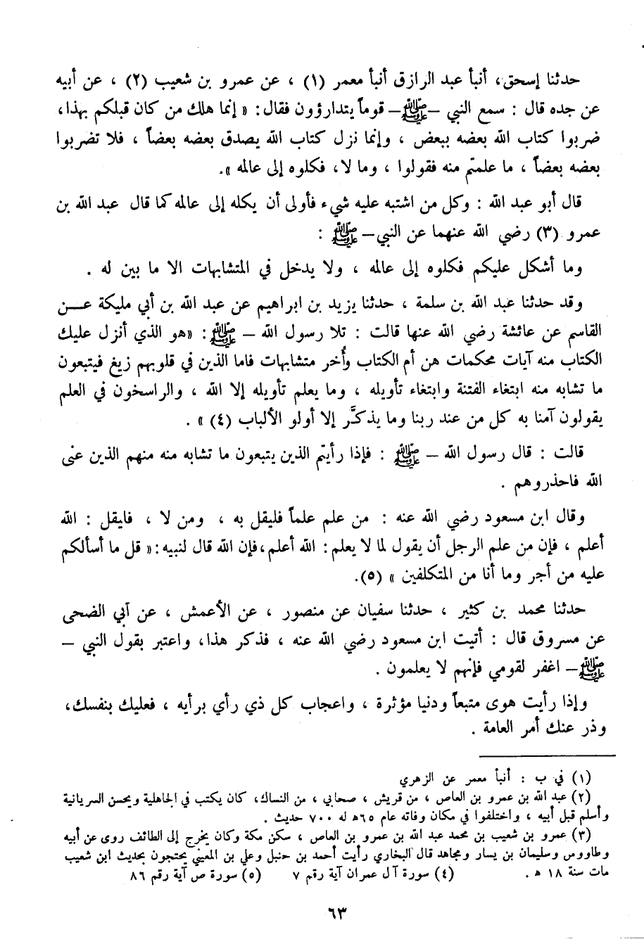 حَدَّثَنَا إِسْحَاقُ، أَنْبَأَ عَبْدُ الرَّزَّاقِ، أَنْبَأَ مَعْمَرٌ، عَنِ الزُّهْرِيِّ، عَنْ عَمْرِو بْنِ شُعَيْبٍ، عَنْ أَبِيهِ، عَنْ جَدِّهِ، قَالَ: سَمِعَ النَّبِيُّ صَلَّى اللهُ عَلَيْهِ وَسَلَّمَ قَوْمًا يَتَدَارَءُونَ فَقَالَ: «إِنَّمَا §هَلَكَ مَنْ كَانَ قَبْلَكُمْ بِهَذَا، ضَرَبُوا كِتَابَ اللَّهِ بَعْضَهُ بِبَعْضٍ، وَإِنَّمَا نَزَلَ كِتَابُ اللَّهِ يُصَدِّقُ بَعْضُهُ بَعْضًا، فَلَا تَضْرِبُوا بَعْضَهُ بَعْضًا، مَا عَلِمْتُمْ مِنْهُ فَقُولُوا، وَمَا لَا، فَكِلُوهُ إِلَى عَالِمِهِ» قَالَ أَبُو عَبْدِ اللَّهِ: «وَكُلُّ مَنِ اشْتَبَهَ عَلَيْهِ شَيْءٌ فَأَوْلَى أَنْ يَكِلَهُ إِلَى عَالِمِهِ»