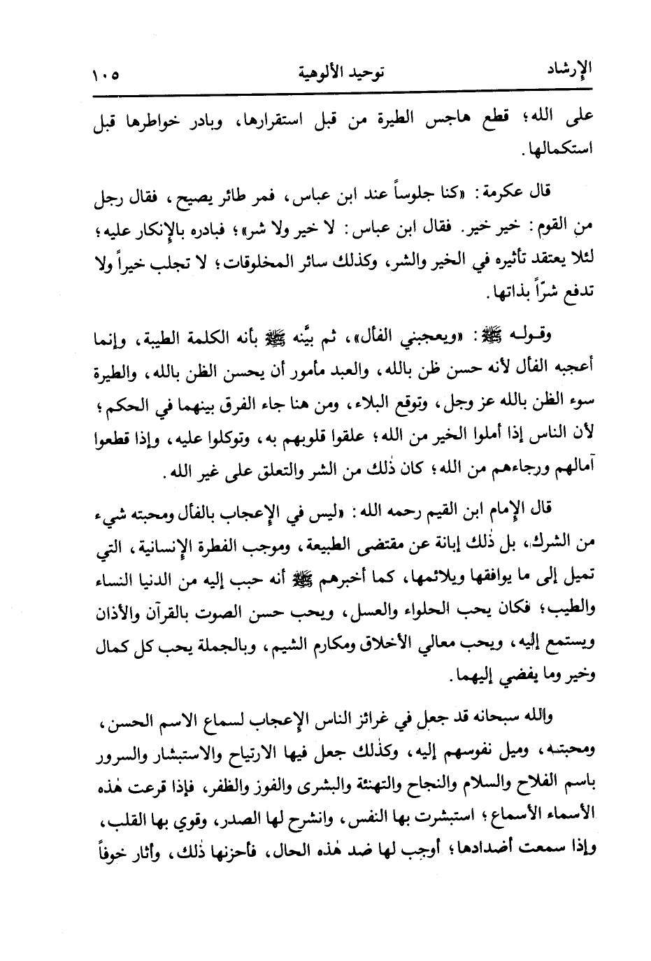 قال الإمام ابن القيم - رحمه الله -: "ليس في الإعجاب بالفأل ومحبته شيء من الشرك، بل ذلك عن مقتضى الطبيعة، وموجب الفطرة الإنسانية، التي تميل إلى ما يوافقها ويلائمها، كما أخبرهم صلى الله عليه وسلم أنه حبب إليه من الدنيا النساء والطيب؛ فكان يحب الحلواء والعسل، ويحب حسن الصوت بالقرآن والأذان ويستمع إليه، ويحب معالي الأخلاق ومكارم الشيم، وبالجملة يحب كل كمال وخير وما يفضي إليهما.