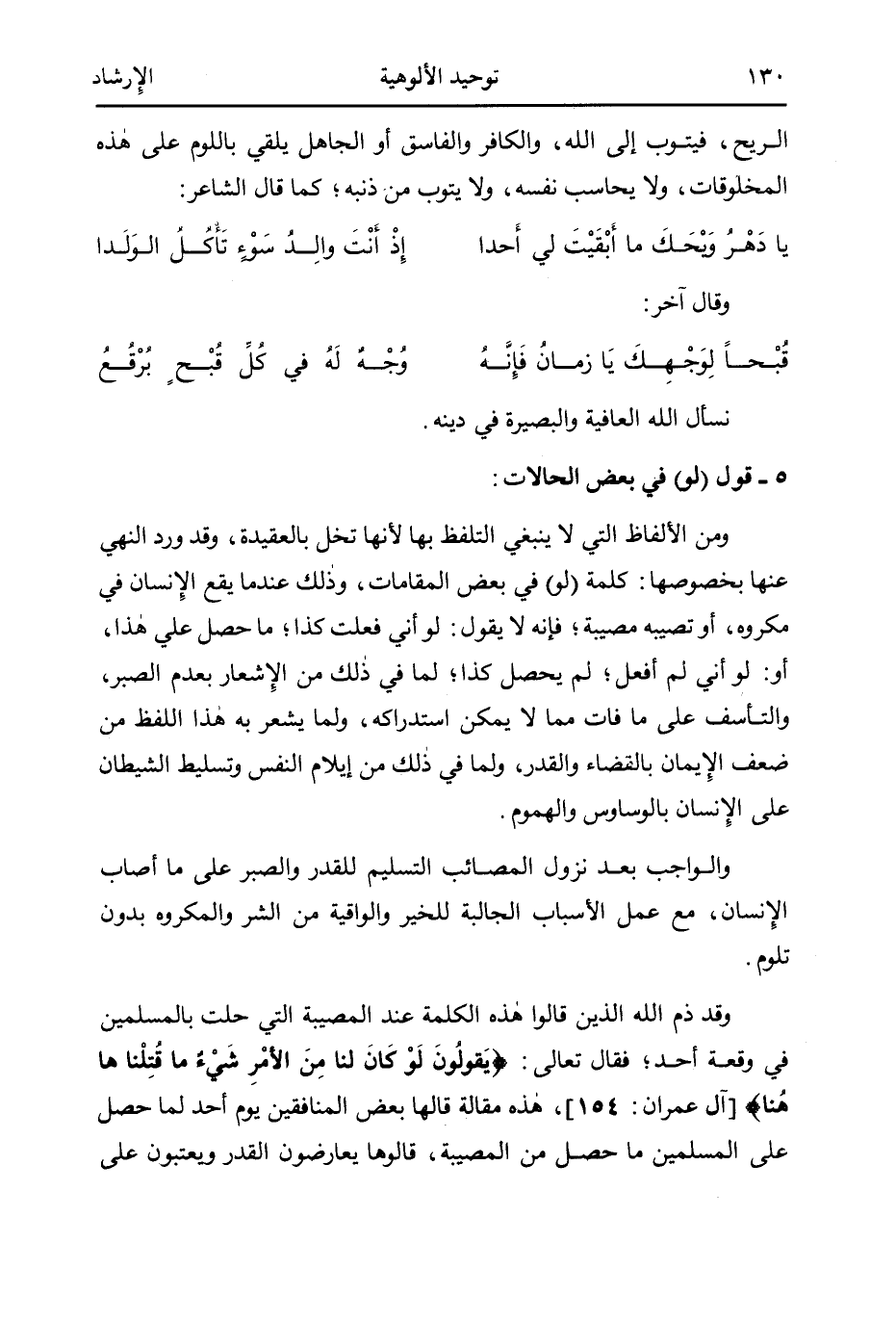 وقد ذم الله الذين قالوا هذه الكلمة عند المصيبة التي حلت بالمسلمين في وقعة أحد؛ فقال تعالى: {يَقُولُونَ لَوْ كَانَ لَنَا مِنَ الأمْرِ شَيْءٌ مَا قُتِلْنَا هَاهُنَا} 1، هذه مقالة قالها بعض المنافقين يوم أحد لما حصل على المسلمين ما حصل من المصيبة، قالوها يعارضون القدر ويعتبون على