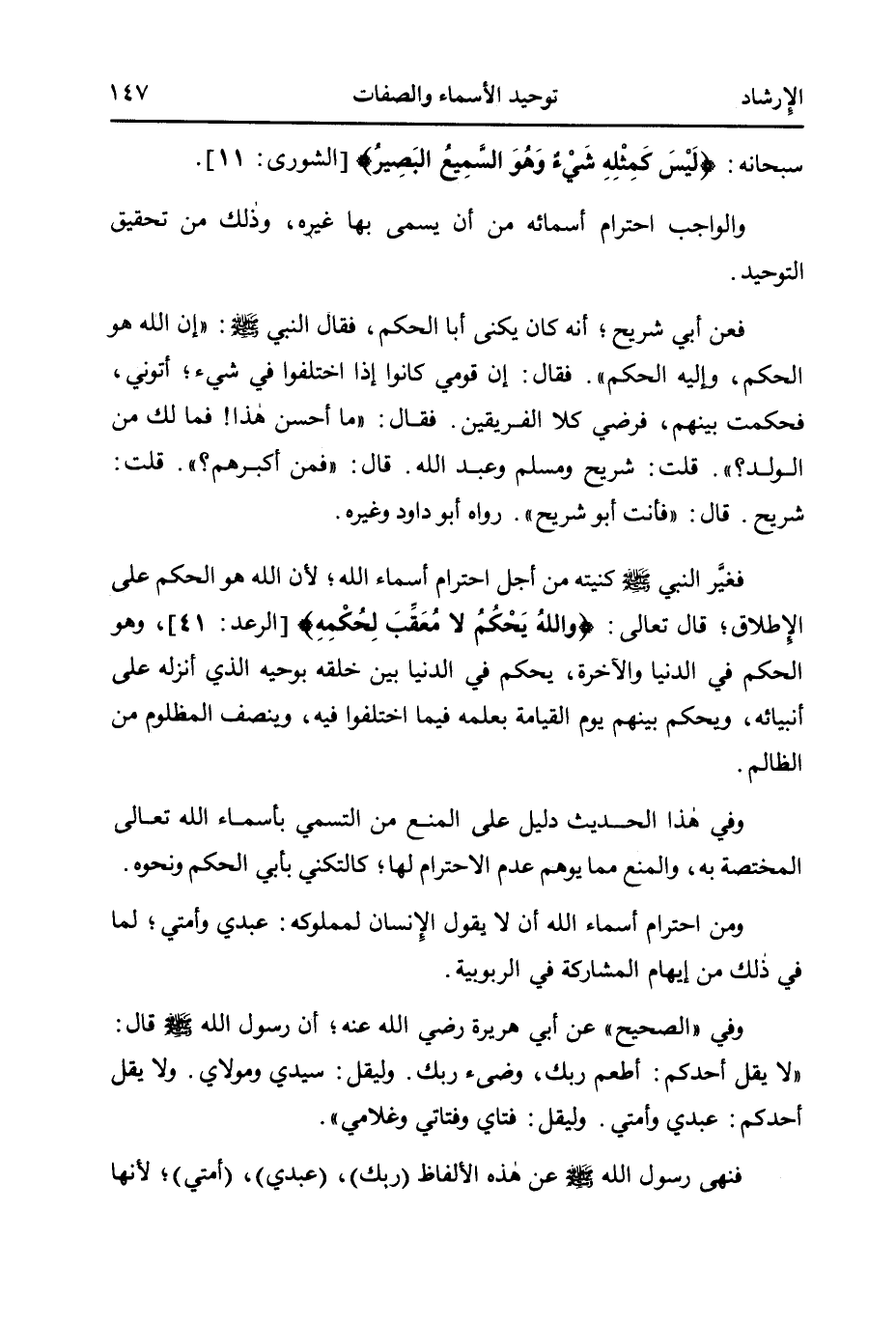 فغيَّر النبي صلى الله عليه وسلمكنيته من أجل احترام أسماء الله؛ لأن الله هو الحكم على الإطلاق؛ قال تعالى: {وَاللَّهُ يَحْكُمُ لا مُعَقِّبَ لِحُكْمِهِ} 2، وهو الحكم في الدنيا والآخرة، يحكم في الدنيا بين خلقه بوحيه الذي أنزله على أنبيائه، ويحكم بينهم يوم القيامة بعلمه فيما اختلفوا فيه، وينصف المظلوم من الظالم.