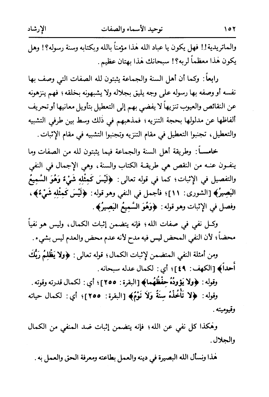 خامسا: وطريقة أهل السنة والجماعة فيما يثبتون لله من الصفات وما ينفون عنه من النقص هي طريقة الكتاب والسنة، وهي الإجمال في النفي والتفصيل في الإثبات؛ كما في قوله تعالى: {لَيْسَ كَمِثْلِهِ شَيْءٌ وَهُوَ السَّمِيعُ الْبَصِيرُ} 1؛ فأجمل في النفي وهو قوله: {لَيْسَ كَمِثْلِهِ شَيْءٌ} وفصل في الإثبات وهو قوله: {وَهُوَ السَّمِيعُ الْبَصِيرُ} .