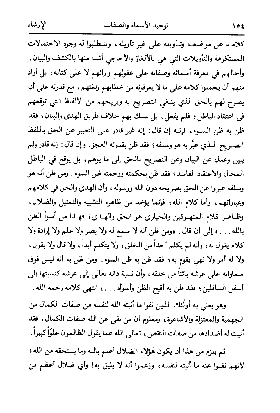 وهو يعني به أولئك الذين يفوا ما أثبته الله لنفسه من صفات الكمال من الجهمية والمعتزلة والأشاعرة، ومعلوم أن من نفى عن الله صفات الكمال؛ فقد أثبت له أضدادها من صفات النقص، تعالى الله عما يقول الظالمون علوّاً كبيرا.