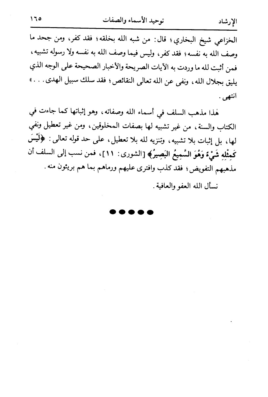 الخزاعي شيخ البخاري؛ قال: من شبه الله بخلقه؛ فقد كفر، ومن جحد ما وصف الله به نفسه؛ فقد كفر، وليس فيما وصف الله به نفسه ولا رسوله تشبيه، فمن أثبت لله ما وردت به الآيات الصريحة والأخبار الصحيحة على الوجه الذي يليق بجلال الله، ونفى عن الله تعالى النقائص؛ فقد سلك سبيل الهدى ... " انتهى.