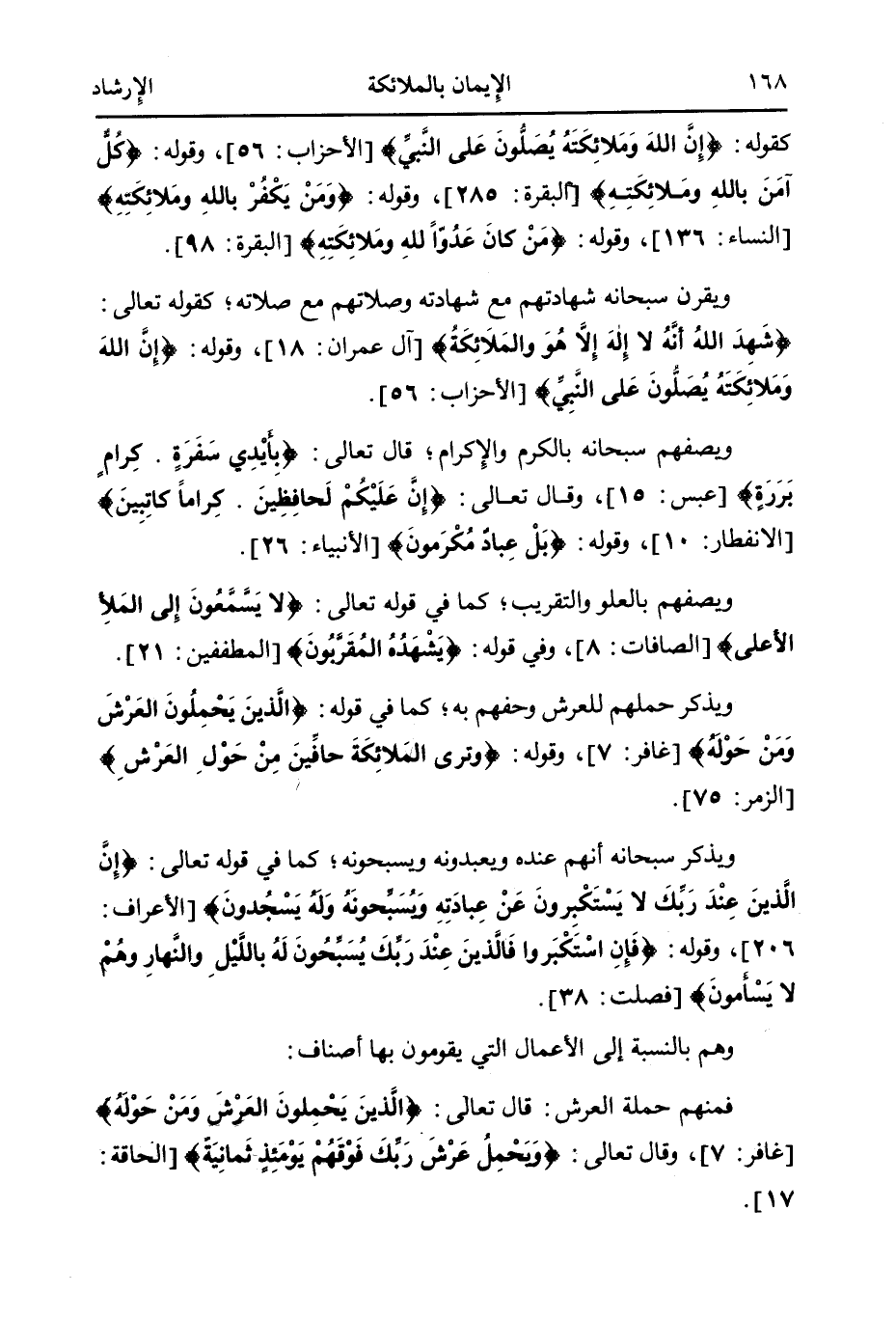 كقوله: {إِنَّ اللَّهَ وَمَلائِكَتَهُ يُصَلُّونَ عَلَى النَّبِيّ} 1، وقوله: {كُلٌّ آمَنَ بِاللَّهِ وَمَلائِكَتِهِ} 2، وقوله: {وَمَنْ يَكْفُرْ بِاللَّهِ وَمَلائِكَتِهِ} 3، وقوله: {مَنْ كَانَ عَدُوّاً لِلَّهِ وَمَلائِكَتِهِ} 4.