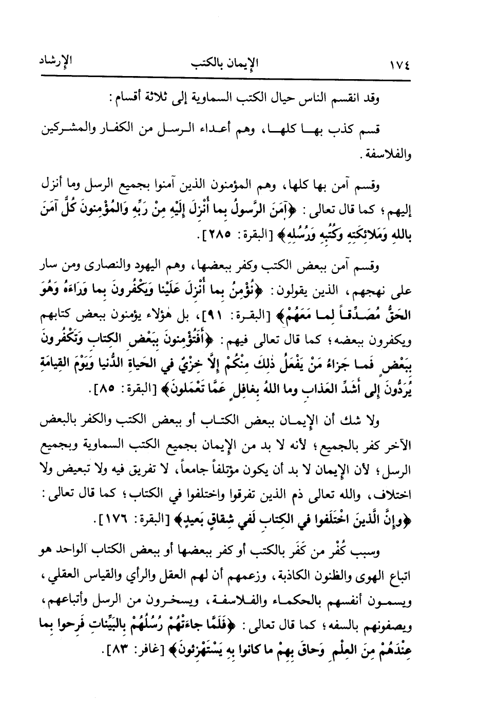 وقسم آمن ببعض الكتب وكفر ببعضها، وهم اليهود والنصارى ومن سار على نهجهم، الذين يقولون: {نُؤْمِنُ بِمَا أُنْزِلَ عَلَيْنَا وَيَكْفُرُونَ بِمَا وَرَاءَهُ وَهُوَ الْحَقُّ مُصَدِّقاً لِمَا مَعَهُمْ} 2، بل هؤلاء يؤمنون ببعض كتابهم ويكفرون ببعضه؛ كما قال تعالى فيهم: {أَفَتُؤْمِنُونَ بِبَعْضِ الْكِتَابِ وَتَكْفُرُونَ بِبَعْضٍ فَمَا جَزَاءُ مَنْ يَفْعَلُ ذَلِكَ مِنْكُمْ إِلاّ خِزْيٌ فِي الْحَيَاةِ الدُّنْيَا وَيَوْمَ الْقِيَامَةِ يُرَدُّونَ إِلَى أَشَدِّ الْعَذَابِ وَمَا اللَّهُ بِغَافِلٍ عَمَّا تَعْمَلُونَ} 3.
