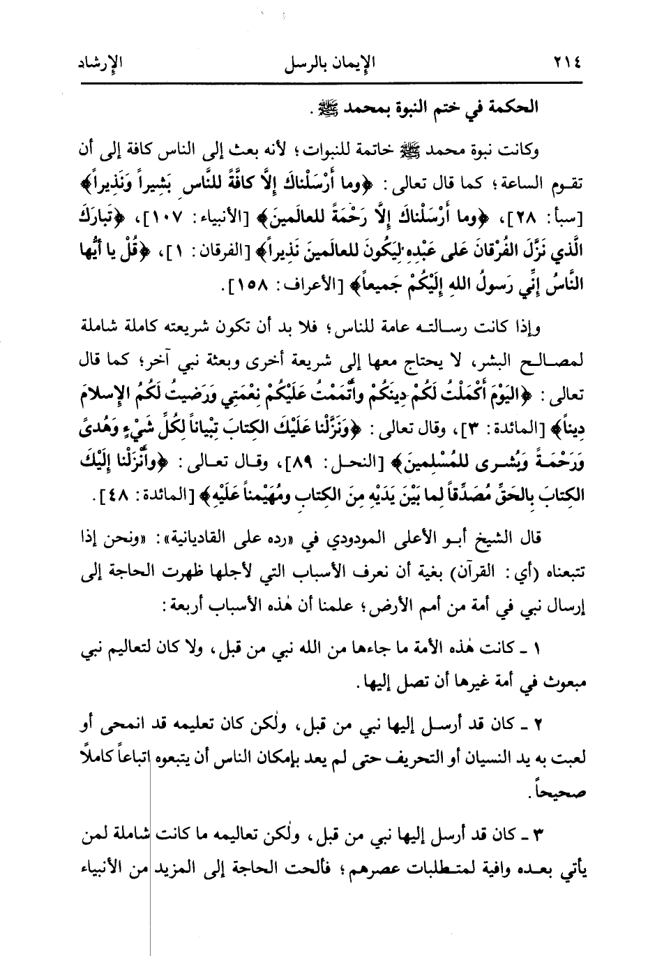 قال الشيخ أبو الأعلى المودودي في (رده على القاديانية) : "ونحن إذا تتبعناه [أي: القرآن] بغية أن نعرف الأسباب التي لأجلها ظهرت الحاجة إلى إرسال نبي في أمة من أمم الأرض؛ علمنا أن هذه الأسباب أربعة: