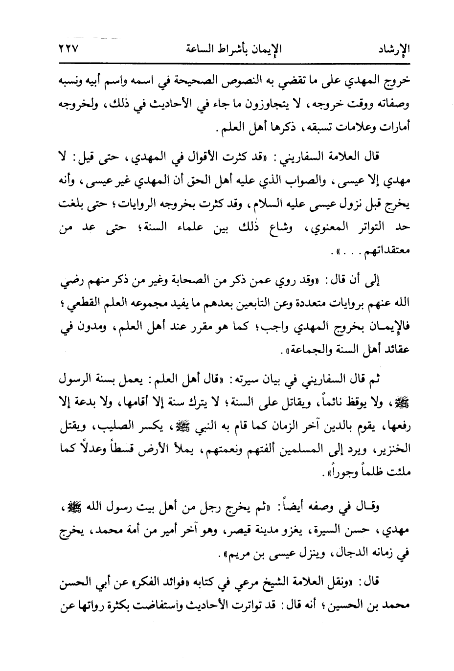 قال العلامة السفاريني: "قد كثرت الأقوال في المهدي، حتى قيل: لا مهدي إلا عيسى، والصواب الذي عليه أهل الحق أن المهدي غير عيسى، وأنه يخرج قبل نزول عيسى عليه السلام، وقد كثرت بخروجه الروايات؛ حتى بلغت حد التواتر المعنوي، وشاع ذلك بين علماء السنة؛ حتى عد من معتقداتهم ... ".
