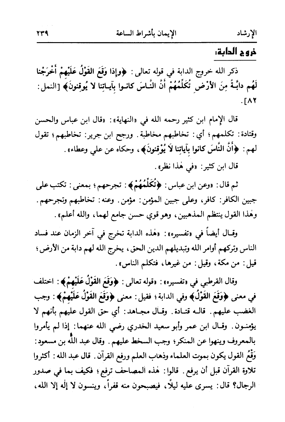وقال القرطبي في "تفسير قوله تعالى: {وَقَعَ الْقَوْلُ عَلَيْهِمْ} : اختلف في معنى {وَقَعَ الْقَوْلُ} وفي الدابة؛ فقيل: معنى {وَقَعَ الْقَوْلُ عَلَيْهِمْ} : وجب الغضب عليهم. قاله قتادة. وقال مجاهد: أي حق القول عليهم بأنهم لا يؤمنون. وقال ابن عمر وأبو سعيد الخدري - رضي الله عنهما -: إذا لم يأمروا بالمعروف وينهوا عن المنكر وجب السخط عليهم. وقال عبد الله بن مسعود: وَقْعُ القول يكون بموت العلماء وذهاب العلم ورفع القرآن. قال عبد الله: أكثروا تلاوة القرآن قبل أن يرفع. قالوا: هذه المصاحف ترفع، فكيف بما في صدور الرجال؟ قال: يسرى عليه ليلاً، فيصبحون منه قفرًا، وينسون لا إله إلا الله،