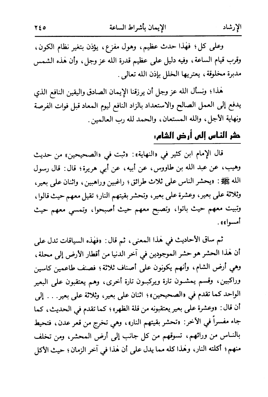 ثم ساق الأحاديث في هذا المعنى، ثم قال: "فهذه السياقات تدل على أن هذا الحشر هو حشر الموجودين في آخر الدنيا من أقطار الأرض إلى محلة، وهي أرض الشام، وأنهم يكونون على أصناف ثلاثة؛ فصنف طاعمين كاسين وراكبين، وقسم يمشون تارة ويركبون تارة أخرى، وهم يعتقبون على البعير الواحد كما تقدم في"الصحيحين"؛ "اثنان على بعير، وثلاثة على بعير ... " إلى أن قال: "وعشرة على بعير يعتقبونه من قلة الظهر"؛ كما تقدم في الحديث، كما جاء مفسرًا في الآخر: "تحشر بقيتهم النار"، وهي تخرج من قعر عدن، فتحيط بالناس من ورائهم، تسوقهم من كل جانب إلى أرض المحشر، ومن تخلف منهم؛ أكلته النار، وهذا كله مما يدل على أن هذا في آخر الزمان؛ حيث الأكل