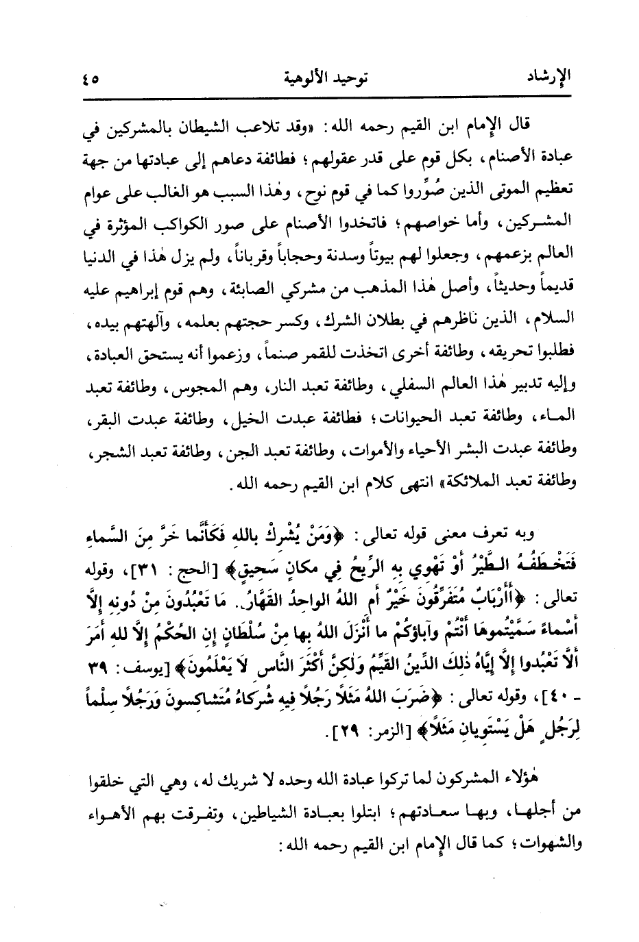 وبه تعرف معنى قوله تعالى: {وَمَنْ يُشْرِكْ بِالله فَكَأَنَّمَا خَرَّ مِنَ السَّمَاءِ فَتَخْطَفُهُ الطَّيْرُ أَوْ تَهْوِي بِهِ الرِّيحُ فِي مَكَانٍ سَحِيقٍ} 1وقوله تعالى: {مَا تَعْبُدُونَ مِنْ دُونِهِ إلاّ أَسْمَاءً سَمَّيْتُمُوهَا أَنْتُمْ وَآبَاؤُكُمْ مَا أَنْزَلَ الله بِهَا مِنْ سُلْطَانٍ إِنِ الْحُكْمُ إلاّ لِلَّهِ أَمَرَ أَلاّ تَعْبُدُوا إلاّ إِيَّاهُ ذَلِكَ الدِّينُ الْقَيِّمُ وَلَكِنَّ أَكْثَرَ النَّاسِ لا يَعْلَمُونَ} 2، وقوله تعالى: {ضَرَبَ الله مَثَلاً رَجُلاً فِيهِ شُرَكَاءُ مُتَشَاكِسُونَ وَرَجُلاً سَلَماً لِرَجُلٍ هَلْ يَسْتَوِيَانِ مَثَلاً} 3