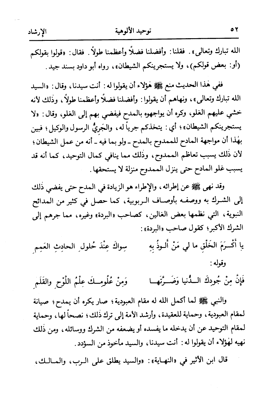 ففي هذا الحديث منع صلى الله عليه وسلم هؤلاء أن يقولوا له: أنت سيدنا، وقال: "السيد الله تبارك وتعالى"، ونهاهم أن يقولوا: وأفضلنا فضلاً وأعظمنا طولاً، وذلك لأنه خشي عليهم الغلو، وكره أن يواجهوه بالمدح فيفضي بهم إلى الغلو، وقال: "لا يستجرينكم الشيطان"، أي: يتخذكم جريا له، والجري الرسول والوكيل؛ فبين بهذا أن مواجهة المادح لممدوح بالمدح - ولو بما فيه - أنه من عمل الشيطان؛ لأن ذلك يسبب تعاظم الممدوح، وذلك مما ينافي كمال التوحيد، كما أنه قد يسبب غلو المادح حتى ينزل الممدوح منزلة لا يستحقها.