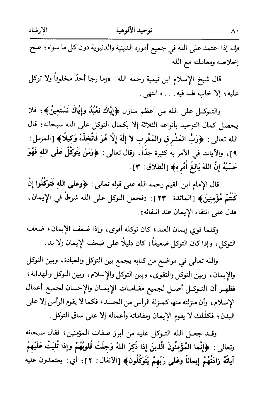 قال الإمام ابن القيم - رحمه الله - على قوله تعالى: {وَعَلَى اللَّهِ فَتَوَكَّلُوا إِنْ كُنْتُمْ مُؤْمِنِينَ} 3:"فجعل التوكل على الله شرطا في الإيمان، فدل على انتفاء الإيمان عند انتفائه".