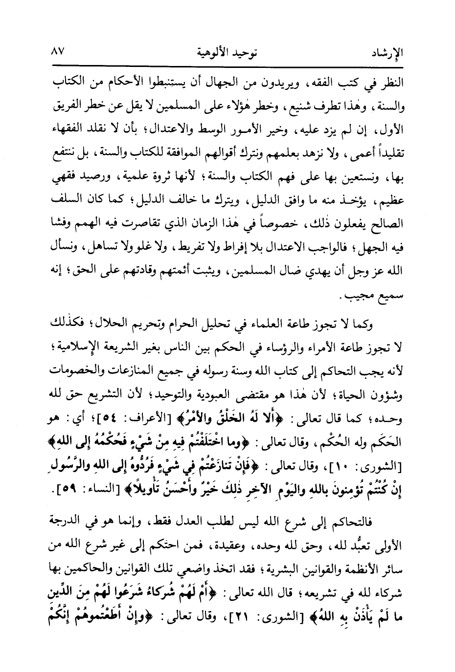 وكما لا يجوز طاعة العلماء في تحليل الحرام وتحريم الحلال؛ فكذلك لا تجوز طاعة الأمراء والرؤساء في الحكم بين الناس بغير الشريعة الإسلامية؛ لأنه يجب التحاكم إلى كتاب الله وسنة رسوله في جميع المنازعات والخصومات وشؤون الحياة؛ لأن هذا هو مقتضى العبودية والتوحيد؛ لأن التشريع حق لله وحده؛ كما قال تعالى: {أَلا لَهُ الْخَلْقُ وَالأمْرُ} 1، أي: هو الحكم وله الحكم، وقال تعالى: {وَمَا اخْتَلَفْتُمْ فِيهِ مِنْ شَيْءٍ فَحُكْمُهُ إِلَى اللَّهِ} 2، وقال تعالى: {فَإِنْ تَنَازَعْتُمْ فِي شَيْءٍ فَرُدُّوهُ إِلَى اللَّهِ وَالرَّسُولِ إِنْ كُنْتُمْ تُؤْمِنُونَ بِاللَّهِ وَالْيَوْمِ الآخِرِ ذَلِكَ خَيْرٌ وَأَحْسَنُ تَأْوِيلاً} 3.