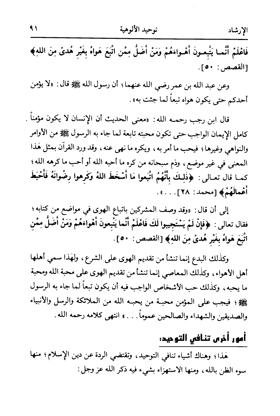 إلى أن قال: "وصف المشركين بإتباع الهوى في مواضع من كتابه؛ فقال تعالى: {فَإِنْ لَمْ يَسْتَجِيبُوا لَكَ فَاعْلَمْ أَنَّمَا يَتَّبِعُونَ أَهْوَاءَهُمْ وَمَنْ أَضَلُّ مِمَّنِ اتَّبَعَ هَوَاهُ بِغَيْرِ هُدىً مِنَ اللَّهِ} 3.