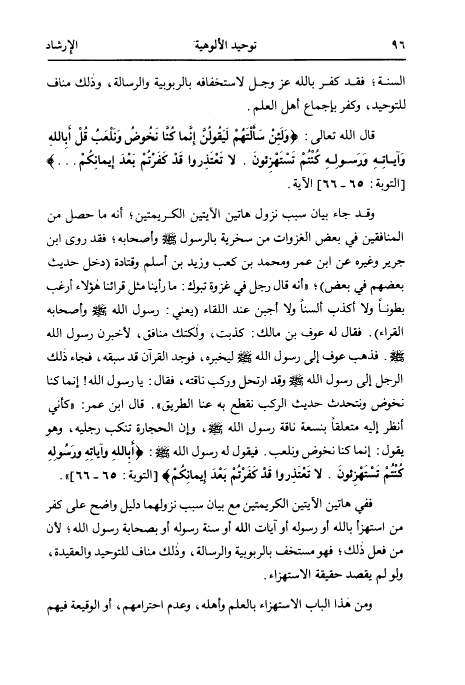 قال الله تعالى: {وَلَئِنْ سَأَلْتَهُمْ لَيَقُولُنَّ إِنَّمَا كُنَّا نَخُوضُ وَنَلْعَبُ قُلْ أَبِاللَّهِ وَآيَاتِهِ وَرَسُولِهِ كُنْتُمْ تَسْتَهْزِئُونَ لا تَعْتَذِرُوا قَدْ كَفَرْتُمْ بَعْدَ إِيمَانِكُمْ ... } 1الآية.