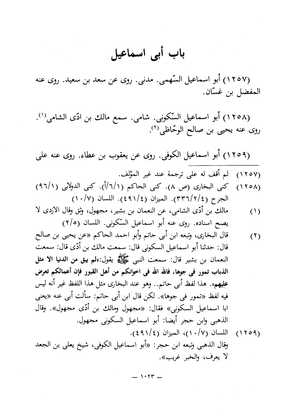 (¬2) قال البخارى، وتبعه ابن أبى حاتم وأبو أحمد الحاكم "عن يحيى بن صالح قال: حدثنا أبو اسماعيل السكونى قال: سمعت مالك بن أدّى قال: سمعت النعمان بن بشير قال: سمعت النبى -صلى اللَّه عليه وسلم- يقول: "لم يبق من الدنيا الا مثل الذباب تمور في جوها، فاللَّه اللَّه في اخوانكم من أهل القبور فإن أعمالكم تعرض علهم". هذا لفظ أبى حاتم. . وهو عند البخارى مثل هذا اللفظ غير أنه ليس فيه لفظ "تمور في جوها". لكن قال ابن أبى حاتم: سألت أبى عنه "يعنى أبا اسماعيل السكونى" فقال: "مجهول ومالك بن أدّى مجهول". وقال الذهبى وابن حجر أيضا: أبو اسماعيل السكونى مجهول.