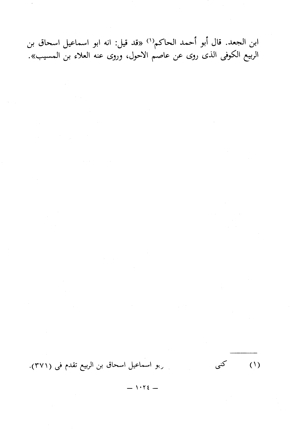 ابن الجعد. قال أبو أحمد الحاكم (¬1) "قد قيل: انه أبو اسماعيل اسحاق بن الربيع الكوفى الذى روى عن عاصم الاحول، وروى عنه العلاء بن المسيب".