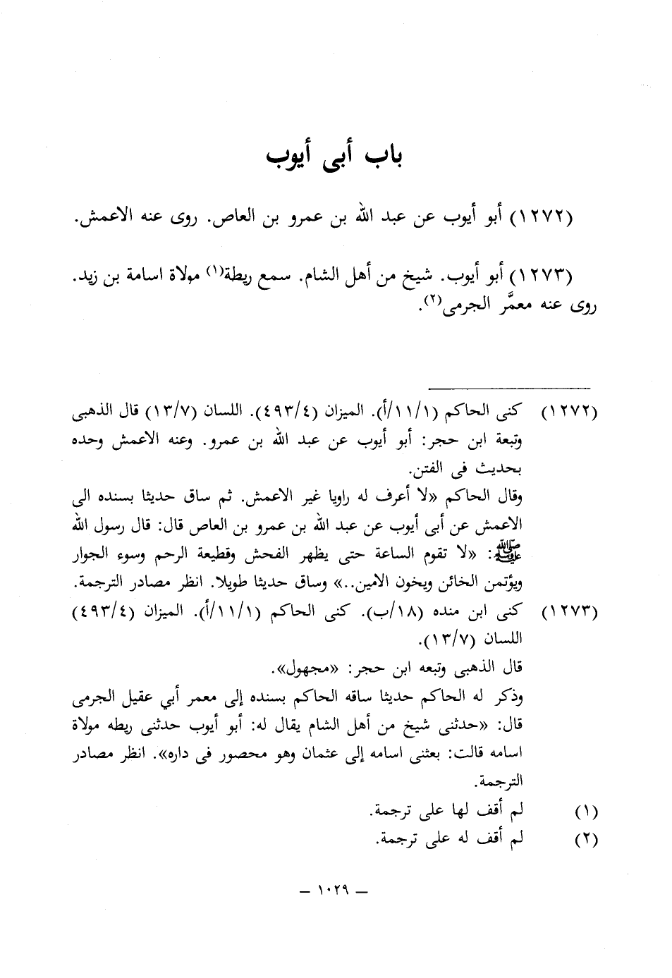 1272 - كنى الحاكم (1/ 11/ أ). الميزان (4/ 493). اللسان (7/ 13) قال الذهبى وتبعه ابن حجر: أبو أيوب عن عبد اللَّه بن عمرو. وعنه الأعمش وحده بحديث في الفتن.