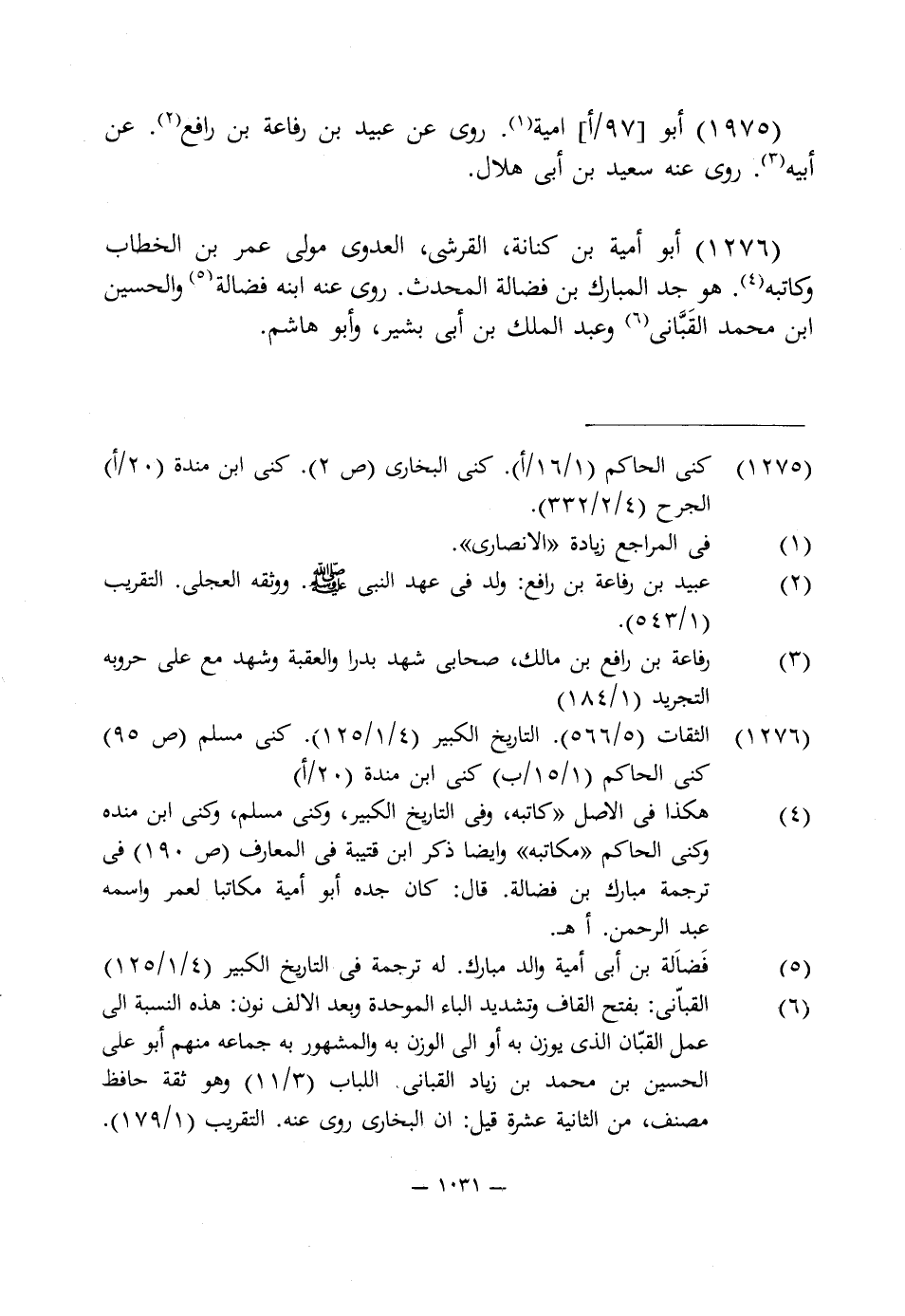 (¬4) هكذا في الأصل "كاتبه، وفى التاريخ الكبير، كنى مسلم، كنى ابن منده وكنى الحاكم "مكاتبه" وأيضا ذكر ابن قتيبة في المعارف (ص 190) في ترجمة مبارك بن فضالة. قال: كان جده أبو أمية مكاتبا لعمر واسمه عبد الرحمن. أهـ.