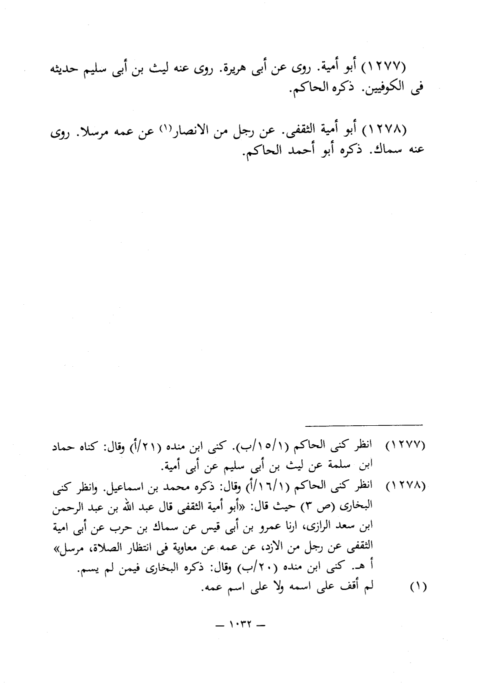 1277 - انظر كنى الحاكم (1/ 15/ ب). كنى ابن منده (21/ أ) وقال: كناه حماد ابن سلمة عن ليث بن أبى سليم عن أبى أمية.