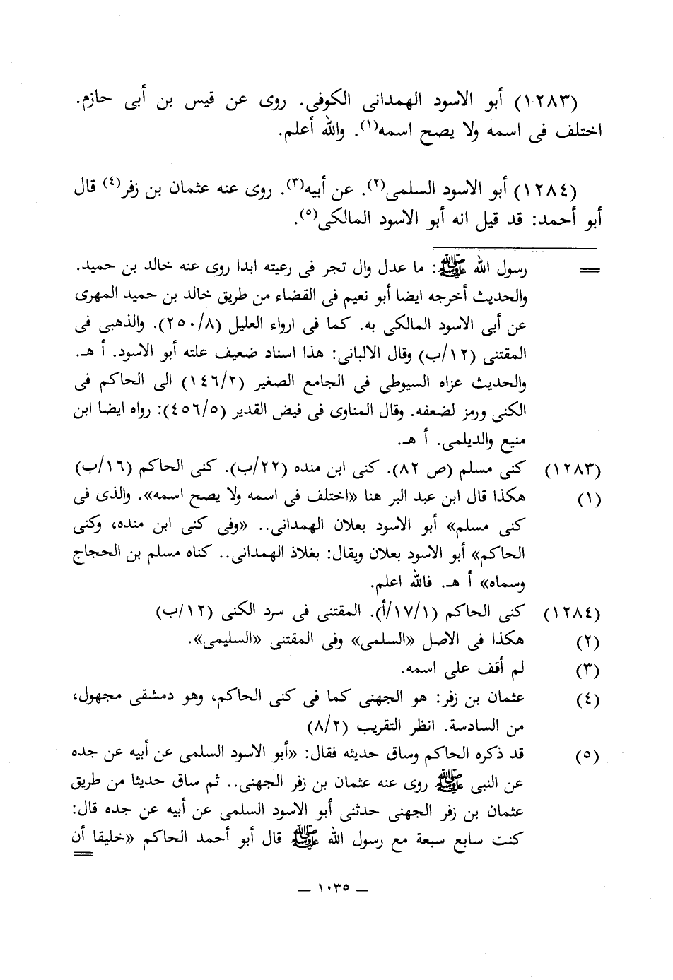 1283 - كنى مسلم (ص 82). كنى ابن منده (22/ ب). كنى الحاكم (16/ ب). (1) هكذا قال ابن عبد البر هنا "اختلف في اسمه ولا يصح اسمه". والذى في كنى مسلم "أبو الأسود بعلان الهمدانى. . " وفى كنى ابن منده، كنى الحاكم "أبو الأسود بعلان ويقال: بغلاذ الهمدانى. . كناه مسلم بن الحجاج وسماه" أهـ. فاللَّه اعلم.
