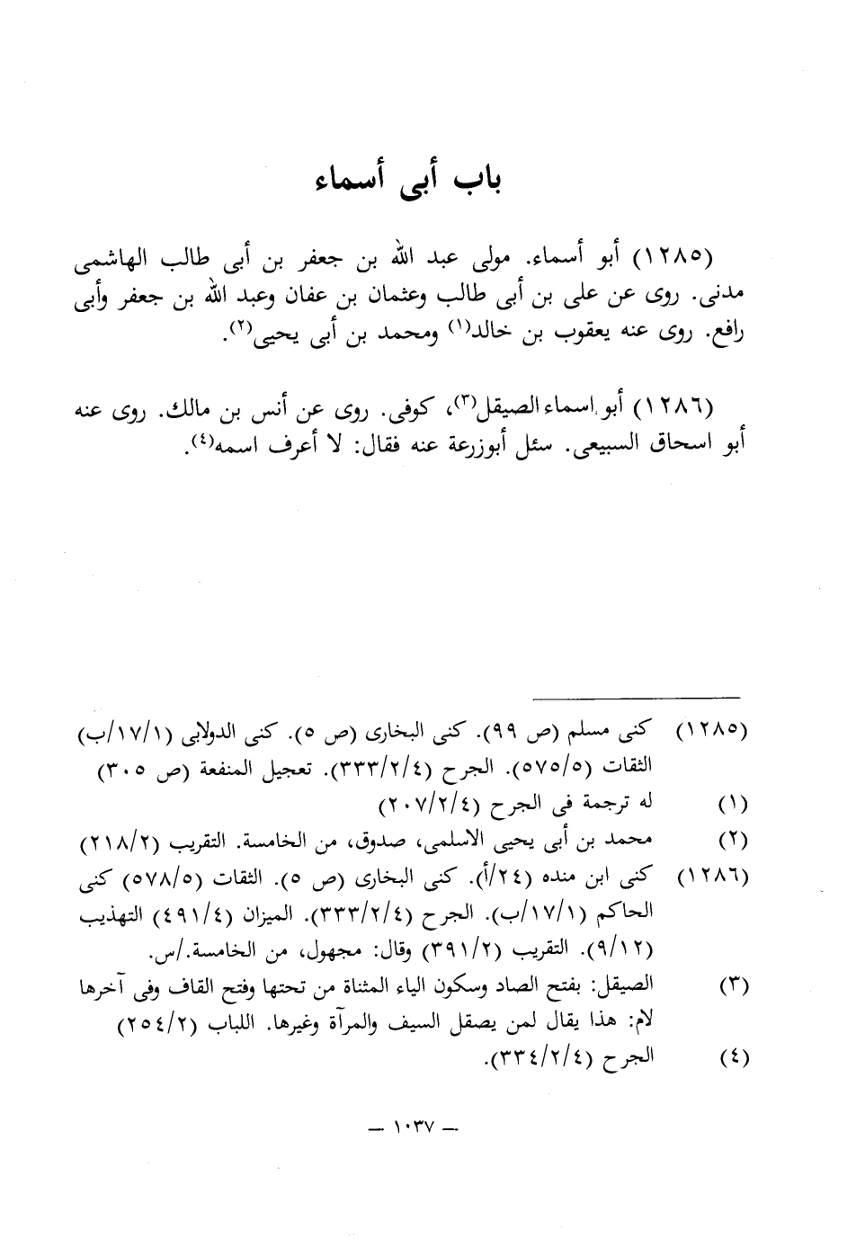 1286 - أبو. أسماء الصيقل (¬3)، كوفى. روى عن أنس بن مالك. روى عنه أبو اسحاق السبيعى. سئل أبو زرعة عنه فقال: لا أعرف اسمه (¬4).