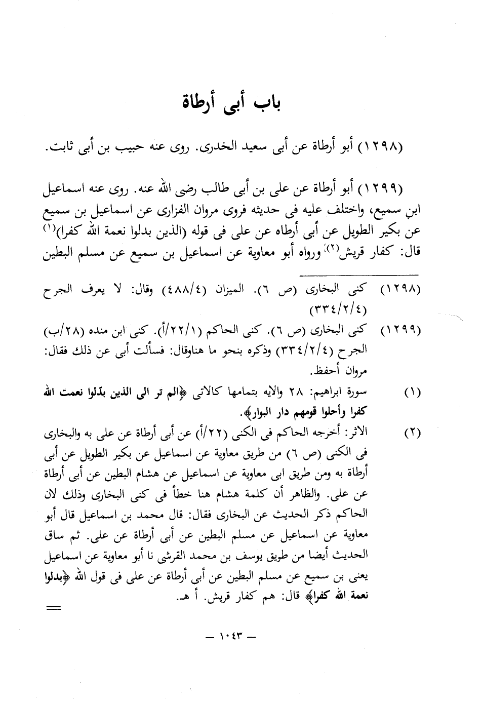 1299 - أبو أرطاة عن على بن أبى طالب رضى اللَّه عنه. روى عنه إسماعيل ابن سميع، واختلف عليه في حديثه فروى مروان الفزارى عن إسماعيل بن سميع عن بكير الطويل عن أبى أرطاه عن على في قوله {الَّذِينَ بَدَّلُوا نِعْمَتَ اللَّهِ كُفْرًا} (¬1) قال: كفار قريش (¬2) ورواه أبو معاوية عن إسماعيل بن سميع عن مسلم البطين