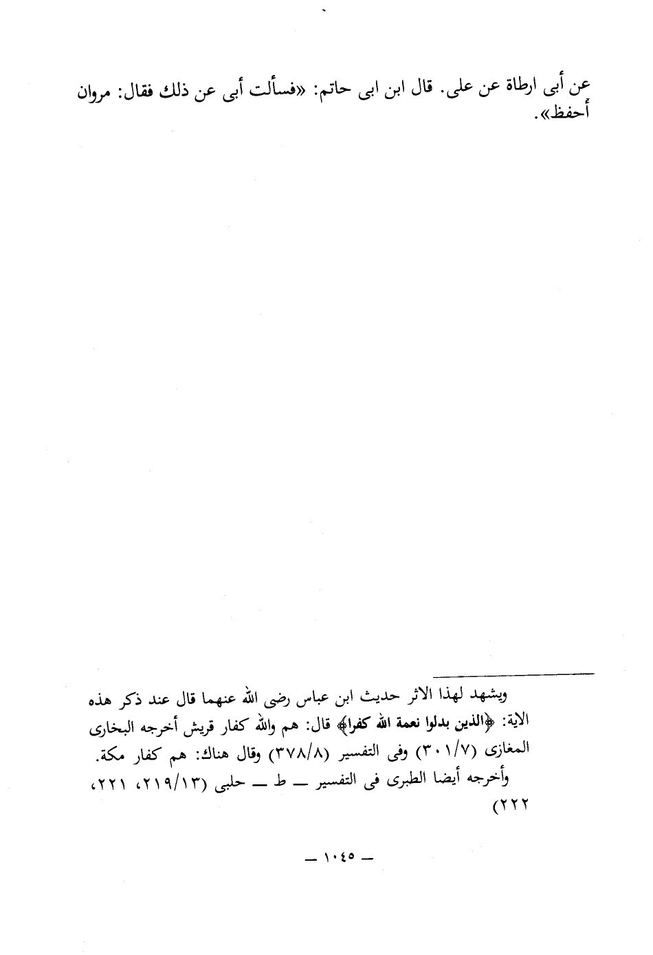 = ويشهد لهذا الاثر حديث ابن عباس رضى اللَّه عنهما قال عند ذكر هذه الآية: {الَّذِينَ بَدَّلُوا نِعْمَتَ اللَّهِ كُفْرًا} قال: هم واللَّه كفار قريش أخرجه البخارى المغازى (7/ 301) وفى التفسير (8/ 378) وقال هناك: هم كفار مكة.