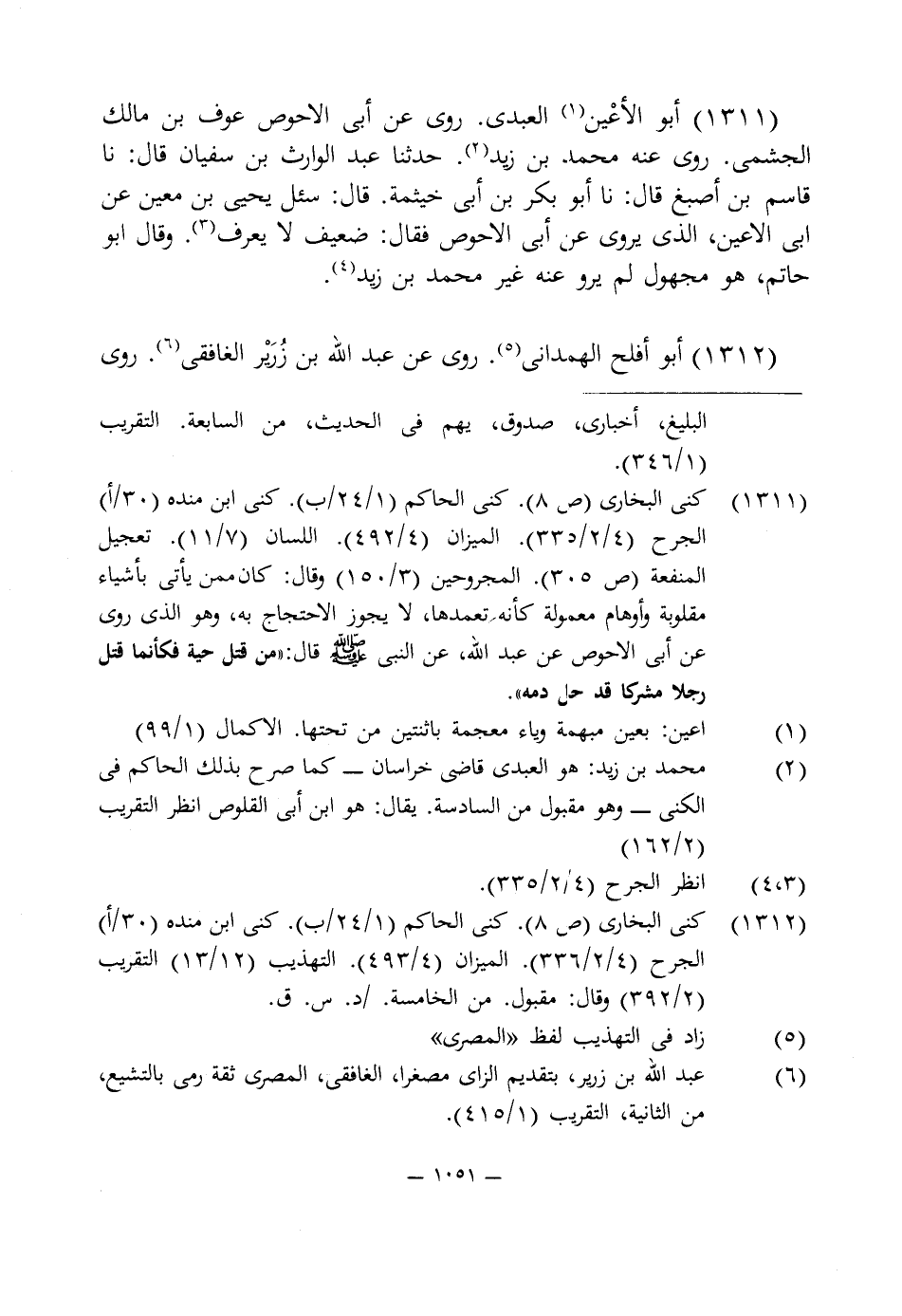 1311 - كنى البخارى (ص 8). كنى الحاكم (1/ 24/ ب). كنى ابن منده (30/ أ) الجرح (4/ 2/ 335). الميزان (4/ 492). اللسان (7/ 11). تعجيل المنفعة (ص 305). المجروحين (3/ 150) وقال: كان ممن يأتى بأشياء مقلوبة وأوهام معمولة كأنه تعمدها، لا يجوز الاحتجاج به، وهو الذى روى عن أبى الاحوص عن عبد اللَّه، عن النبى -صلى اللَّه عليه وسلم- قال: "من قتل حية فكأنما قتل رجلا مشركا قد حل دمه".