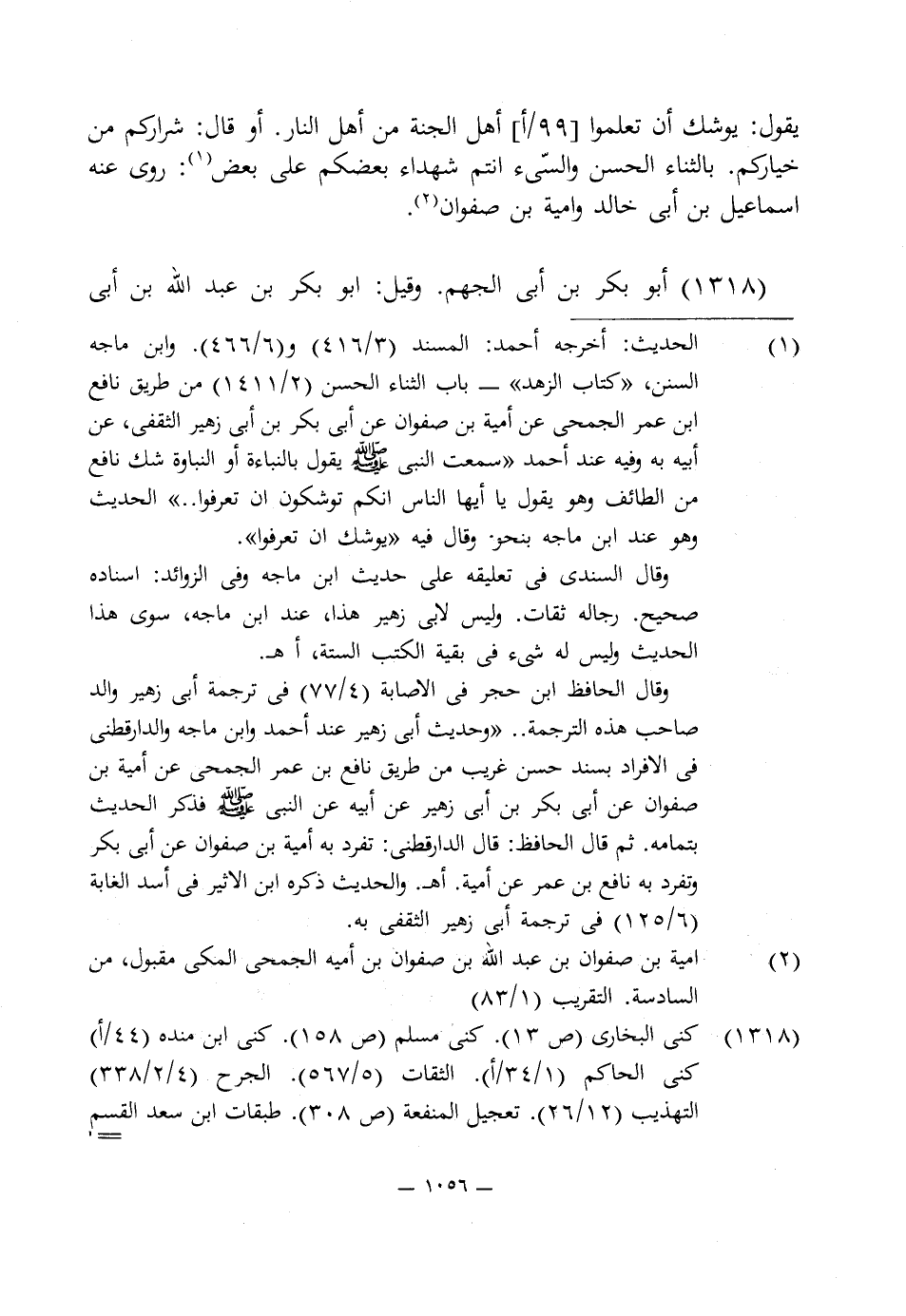 1318 - كنى البخارى (ص 13). كنى مسلم (ص 158). كنى ابن منده (44/ أ) كنى الحاكم (1/ 34/ أ). الثقات (5/ 567). الجرح (4/ 2/ 338) التهذيب (12/ 26). تعجيل المنفعة (ص 308). طبقات ابن سعد القسم =