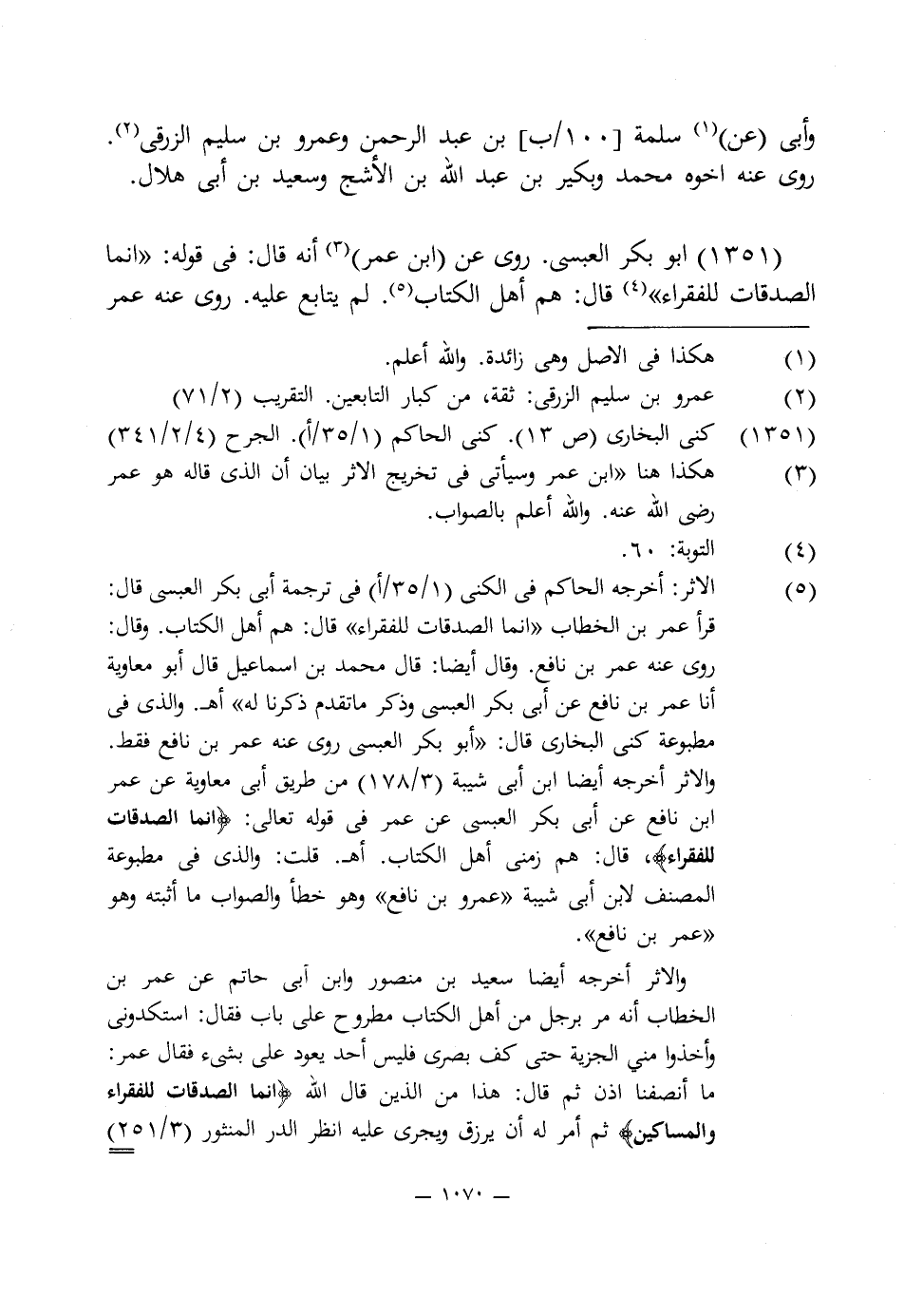 (¬5) الاثر: أخرجه الحاكم في الكنى (1/ 35/ أ) في ترجمة أبى بكر العبسى قال: قرأ عمر بن الخطاب "إنما الصدقات للفقراء" قال: هم أهل الكتاب. وقال: روى عنه عمر بن نافع. وقال أيضا: قال محمد بن إسماعيل قال أبو معاوية أنا عمر بن نافع عن أبى بكر العبسى وذكر ما تقدم ذكرنا له" أهـ. والذى في مطبوعة كنى البخارى قال: "أبو بكر العبسى روى عنه عمر بن نافع فقط. والاثر أخرجه أيضا ابن أبى شيبة (3/ 178) من طريق أبى معاوية عن عمر ابن نافع عن أبى بكر العبسى عن عمر في قوله تعالى: {إِنَّمَا الصَّدَقَاتُ لِلْفُقَرَاءِ} قال: هم زمنى أهل الكتاب. أهـ. قلت: والذى في مطبوعة المصنف لابن أبى شيبة "عمرو بن نافع" وهو خطأ والصواب ما أثبته وهو "عمر بن نافع".