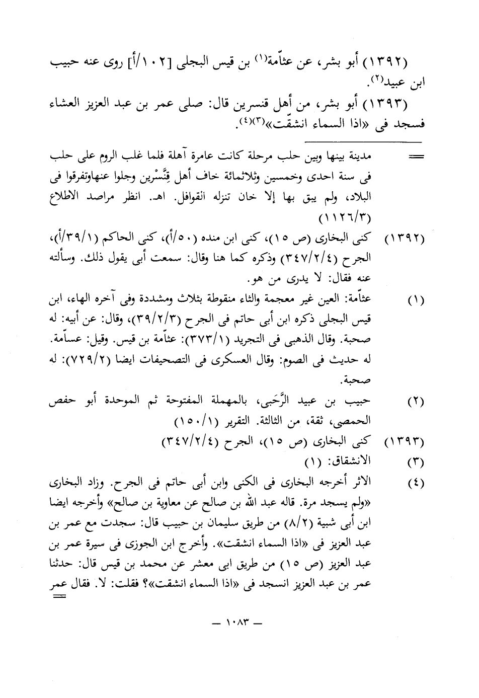 1393 - أبو بشر، من أهل قنسرين قال: صلى عمر بن عبد العزيز العشاء فسجد في {إِذَا السَّمَاءُ انْشَقَّتْ} (¬3) (¬4).