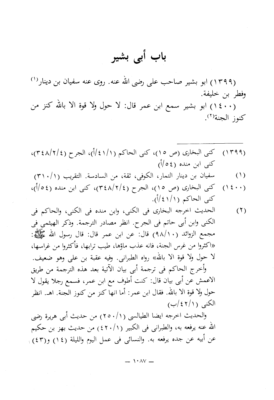 1400 - أبو بشير سمع ابن عمر قال: لا حول ولا قوة إلا باللَّه كنز من كنوز الجنة (¬2).