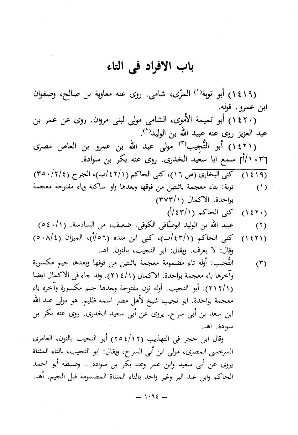 (¬3) التُّجيب: أوله تاء مضمومة معجمة باثنتين من فوقها وبعدها جيم مكسورة وآخرها باء معجمة بواحدة. الاكمال (1/ 214). وقد جاء في الاكمال أيضا (1/ 212). أبو النجيب. أوله نون مفتوحة وبعدها جيم مكسورة وآخره باء معجمة بواحدة. أبو نجيب شيخ لأهل مصر اسمه ظليم. هو مولى عبد اللَّه ابن سعد بن أبى سرح. يروى عن أبى سعيد الخدرى. روى عنه بكر بن سوادة. اهـ.