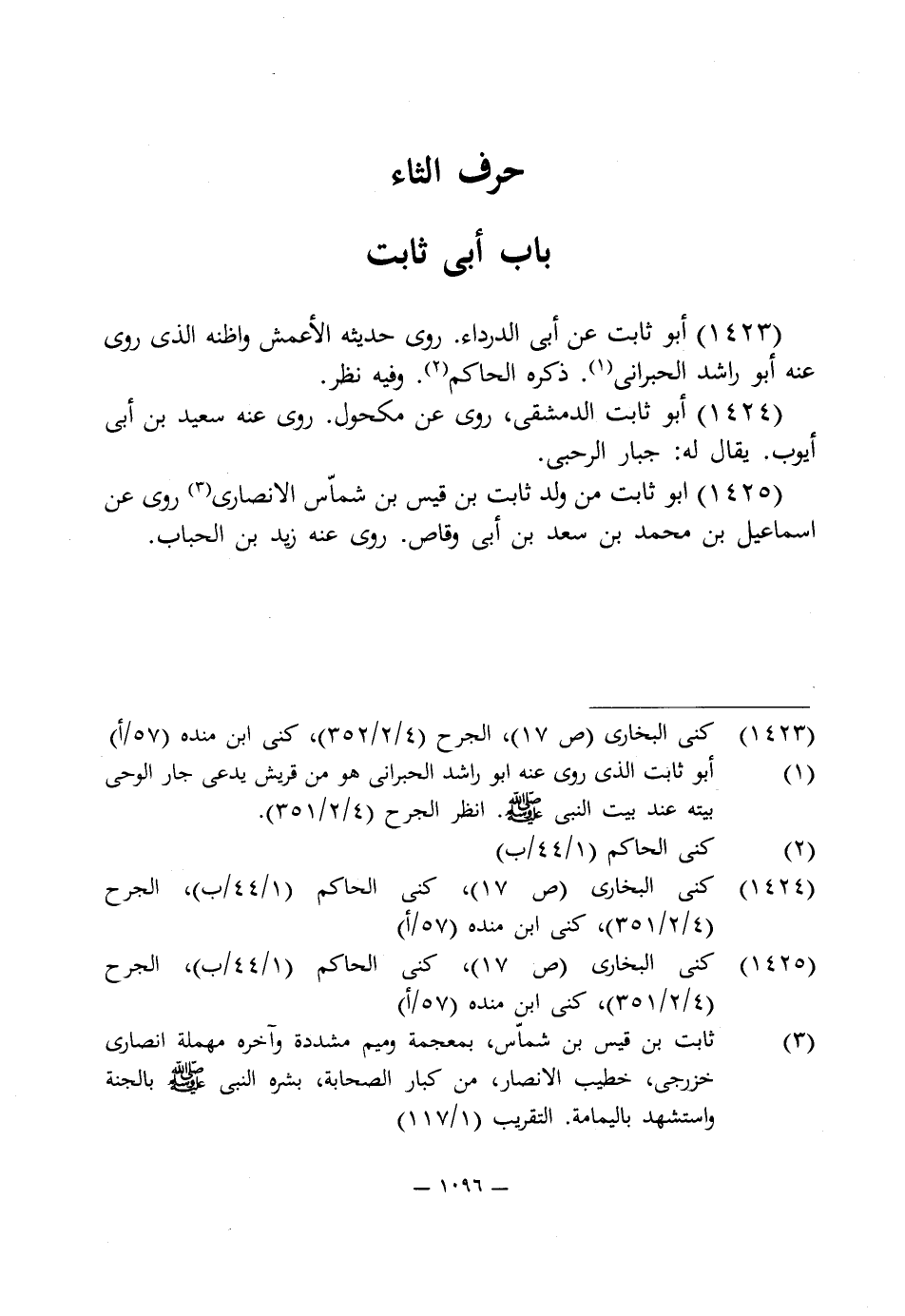 1423 - أبو ثابت عن أبى الدرداء. روى حديثه الأعمش واظنه الذى روى عنه أبو راشد الحبرانى (¬1). ذكره الحاكم (¬2). وفيه نظر.
