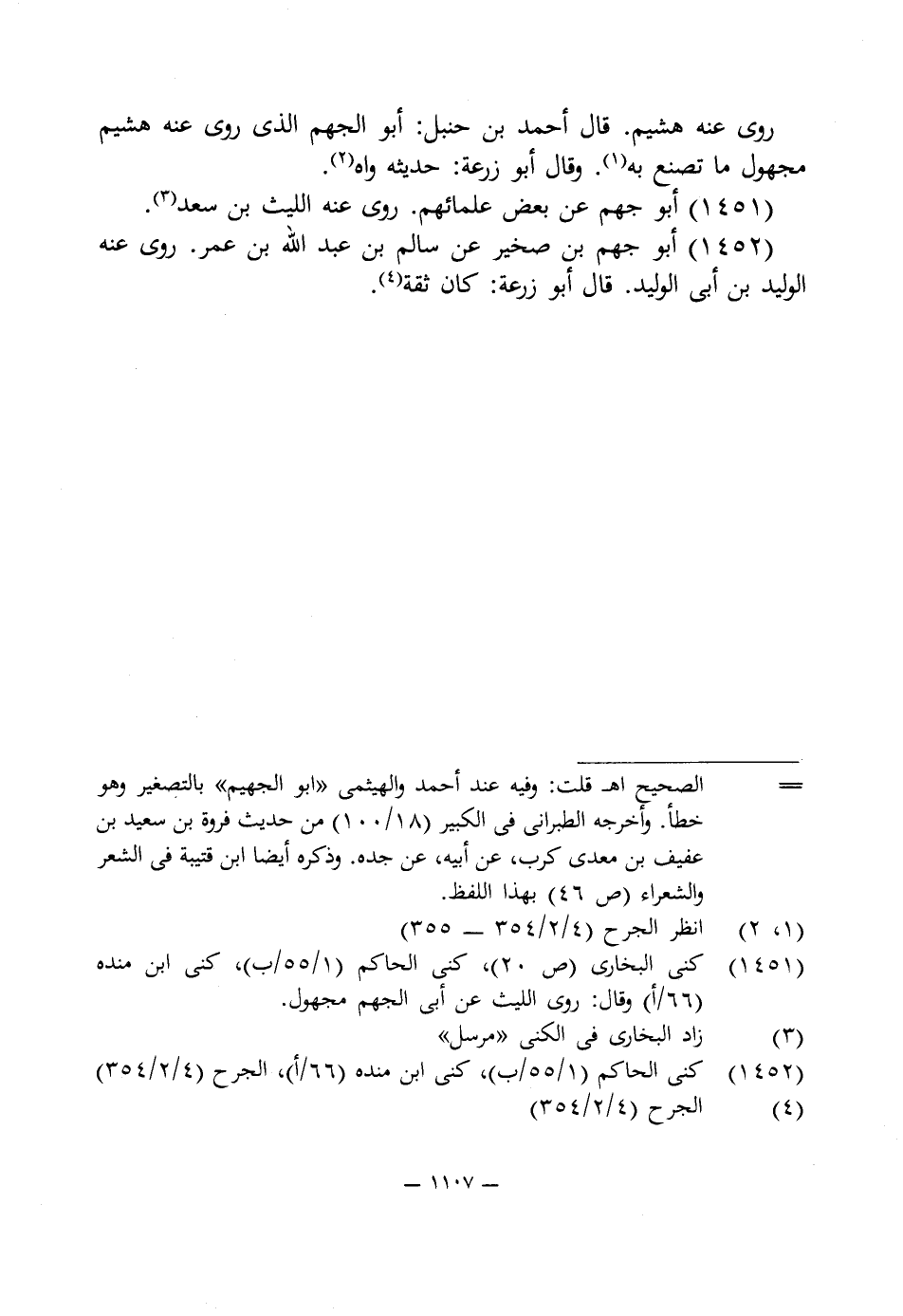 1451 - كنى البخارى (ص 20)، كنى الحاكم (1/ 55/ ب)، كنى ابن منده (66/ أ) وقال: روى الليث عن أبى الجهم مجهول.
