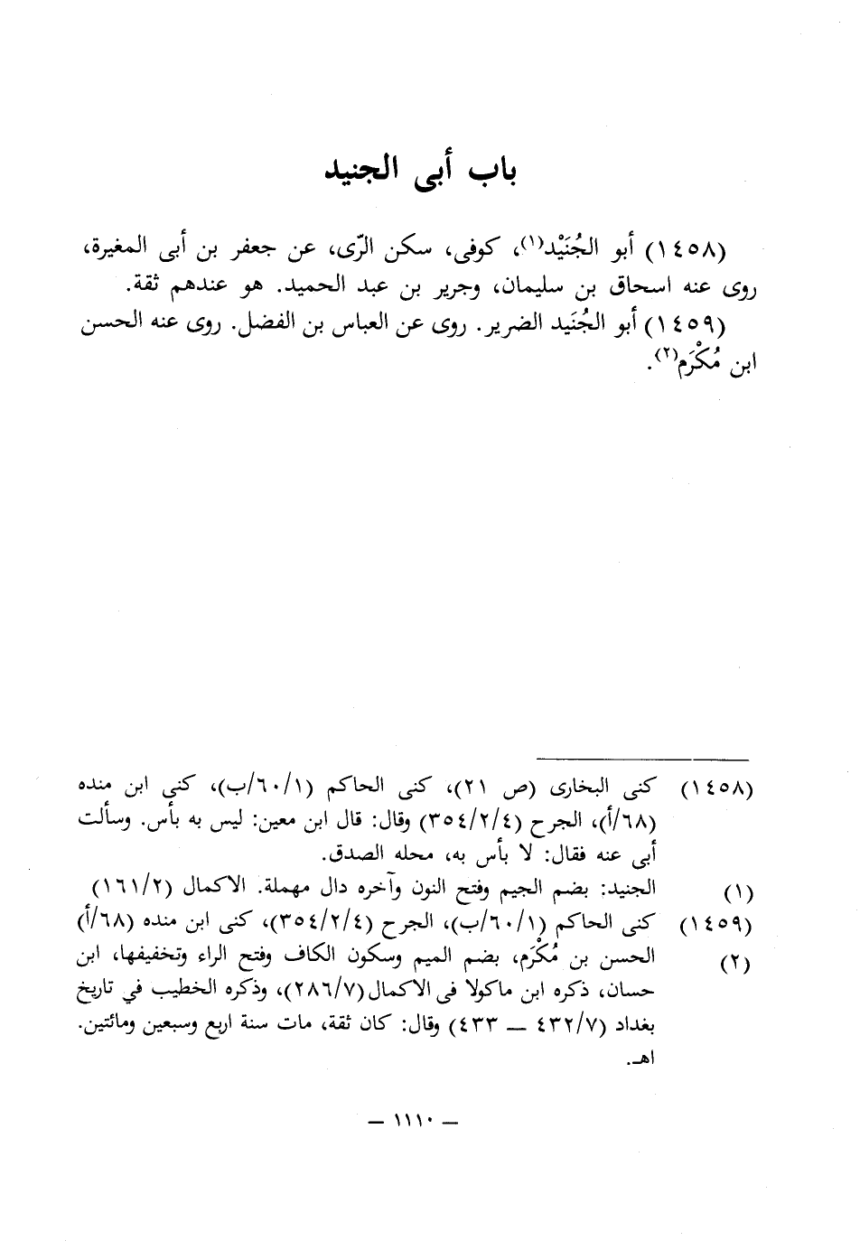 1458 - أبو الجُنَيْد (¬1)، كوفى، سكن الرّى، عن جعفر بن أبى المغيرة، روى اسحاق بن سليمان، وجرير بن عبد الحميد. هو عندهم ثقة.