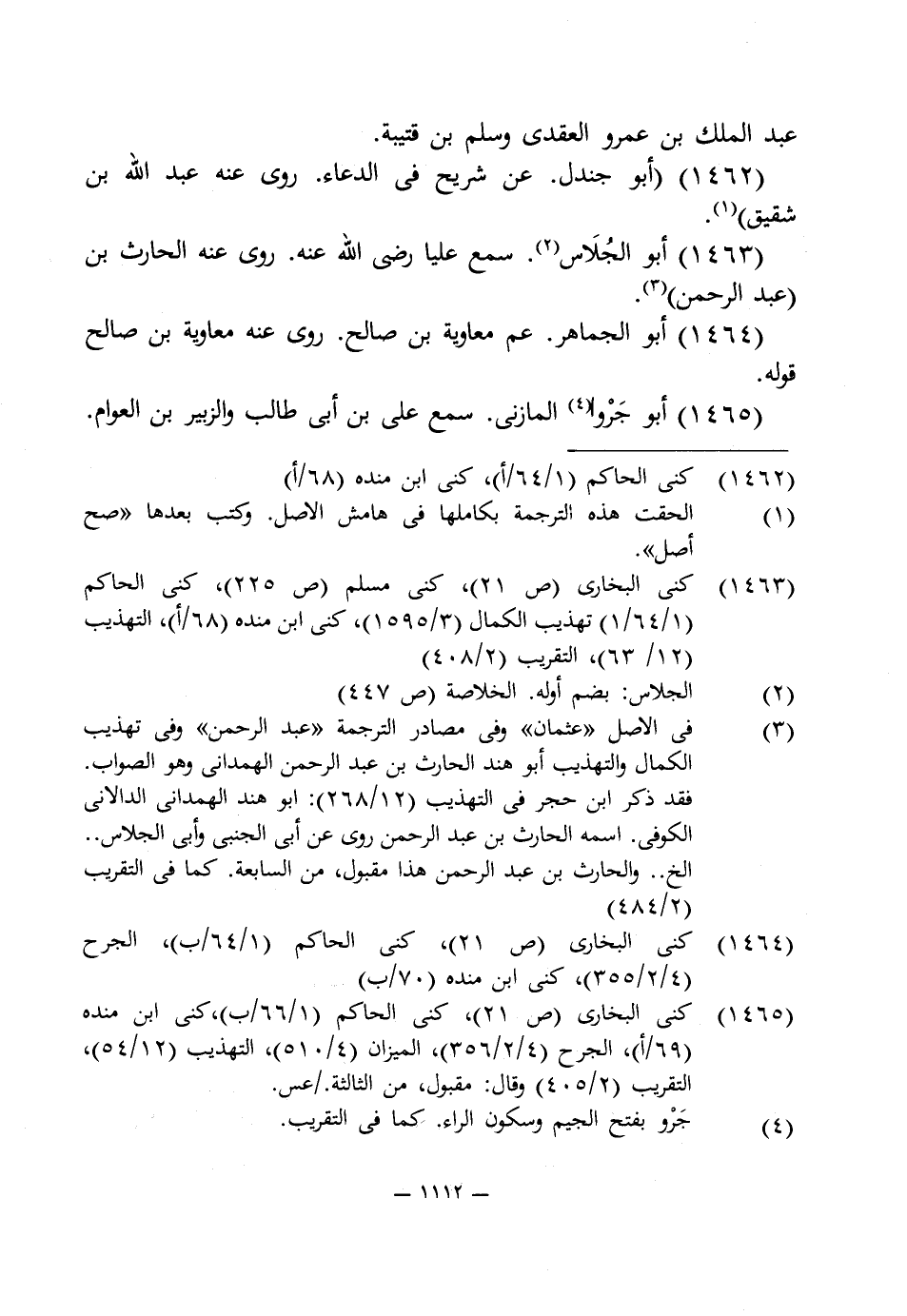 (¬3) في الأصل "عثمان" وفى مصادر الترجمة "عبد الرحمن" وفى تهذيب الكمال والتهذيب أبو هند الحارث بن عبد الرحمن الهمدانى وهو الصواب. فقد ذكر ابن حجر في التهذيب (12/ 268): أبو هند الهمدانى الدالانى الكوفى. اسمه الحارث بن عبد الرحمن روى عن أبى الجنبى وأبى الجلاس. . الخ. . والحارث بن عبد الرحمن هذا مقبول، من السابعة. كما في التقريب (2/ 484).