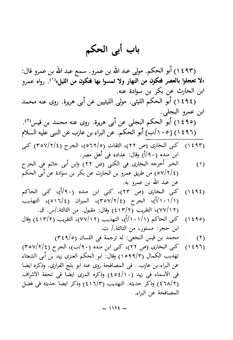 1496 - كنى البخارى (ص 22)، كنى ابن منده (90/ ب)، الجرح (4/ 2/ 357) تهذيب الكمال (3/ 1599) وقال: أبو الحكم العنزى زيد بن أبى الشعثاء عن البراء بن عازب. . في المصافحة روى عنه أبو بلج الفزارى. وذكره أيضا في الأسماء في زيد (10/ 454) وذكره المزى أيضا في تحفة الاشراف (2/ 468) وذكر حديثه. التهذيب (3/ 416) وذكر أيضا حديثه في فضل المصافحة عن البراء.