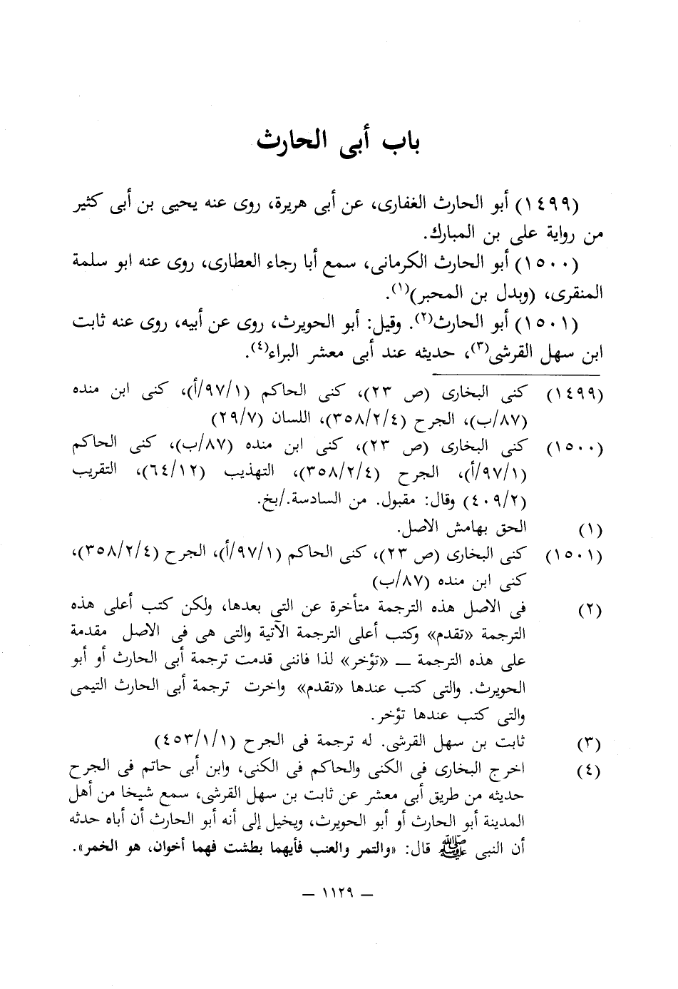 (¬2) في الأصل هذه الترجمة متأخرة عن التى بعدها، ولكن كتب أعلى هذه الترجمة "تقدم" كتب أعلى الترجمة الآتية والتى هى في الأصل مقدمة على هذه الترجمة - "تؤخر" لذا فاننى قدمت ترجمة أبى الحارث أو أبو الحويرث. والتى كتب عندها "تقدم" واخرت ترجمة أبى الحارث التيمى والتى كتب عندها تؤخر.
