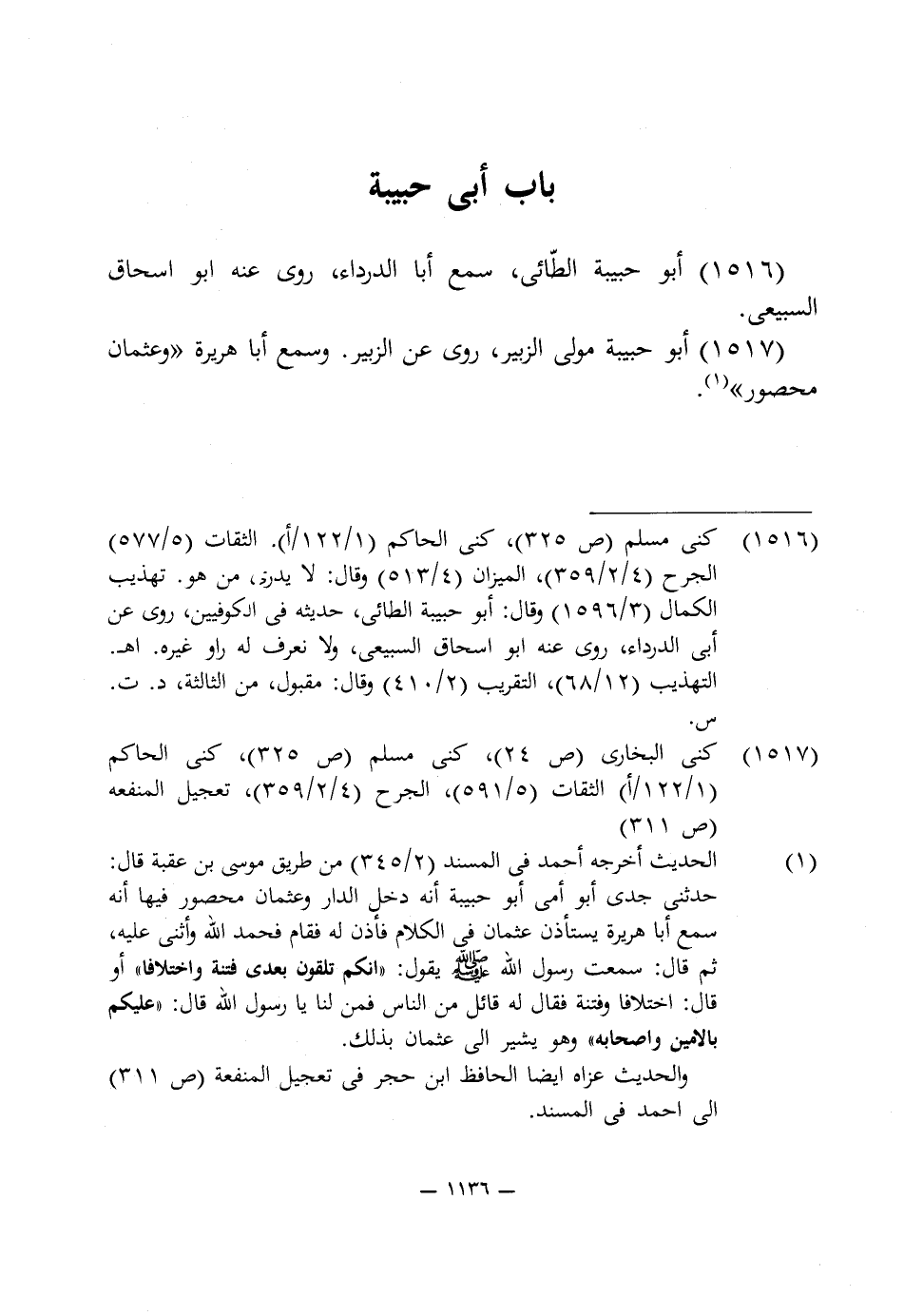 1516 - كنى مسلم (ص 325)، كنى الحاكم (1/ 22/ أ). الثقات (5/ 577) الجرح (4/ 2/ 359)، الميزان (4/ 513) وقال: لا يدرى من هو. تهذيب الكمال (3/ 1596) وقال: أبو حبيبة الطائى، حديثه في الكوفيين، روى عن أبى الدرداء، روى عنه أبو اسحاق السبيعى، ولا نعرف له راو غيره. اهـ. التهذيب (12/ 68)، التقريب (2/ 410) وقال: مقبول، من الثالثة، د. ت. س.