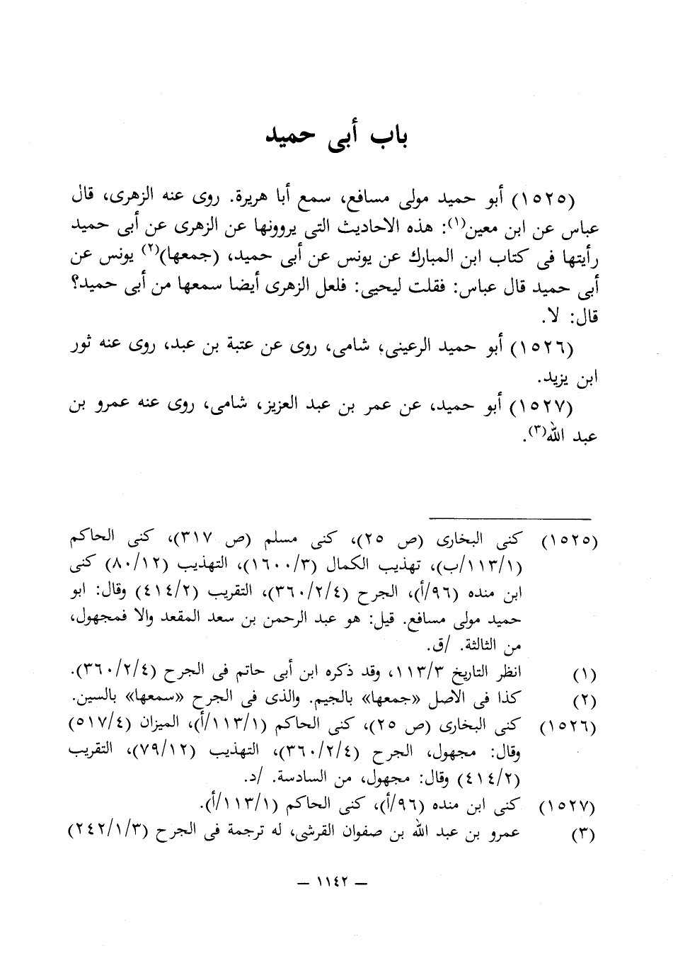 1525 - أبو حميد مولى مسافع، سمع أبا هريرة. روى عنه الزهرى، قال عباس عن ابن معين (¬1): هذه الأحاديث التى يروونها عن الزهرى عن أبى حميد رأيتها في كتاب ابن المبارك عن يونس عن أبى حميد، (جمعها) (¬2) يونس عن أبى حميد قال عباس: فقلت ليحيى: فلعل الزهرى أيضا سمعها من أبى حميد؟ قال: لا.