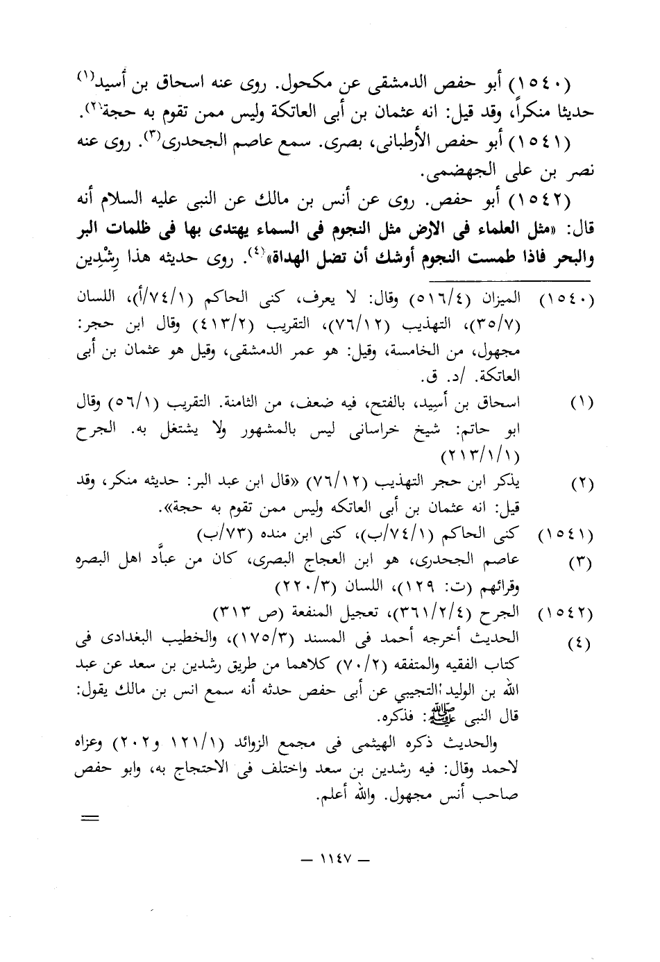 1542 - أبو حفص. روى عن أنس بن مالك عن النبى عليه السلام أنه قال: "مثل العلماء في الارض مثل النجوم في السماء يهتدى بها في ظلمات البر والبحر فإذا طمست النجوم أوشك أن تضل الهداة" (¬4). روى حديثه هذا رِشْدِين