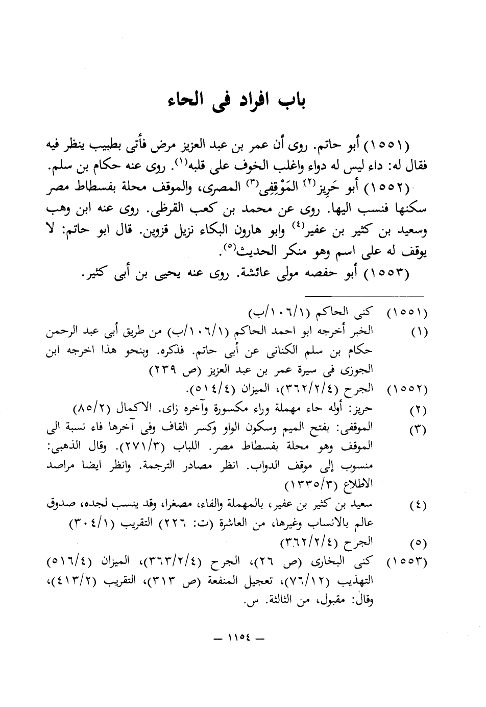 1551 - أبو حاتم. روى أن عمر بن عبد العزيز مرض فأتى بطبيب ينظر فيه فقال له: داء ليس له دواء وأغلب الخوف على قلبه (1). روى عنه حكام بن سلم.