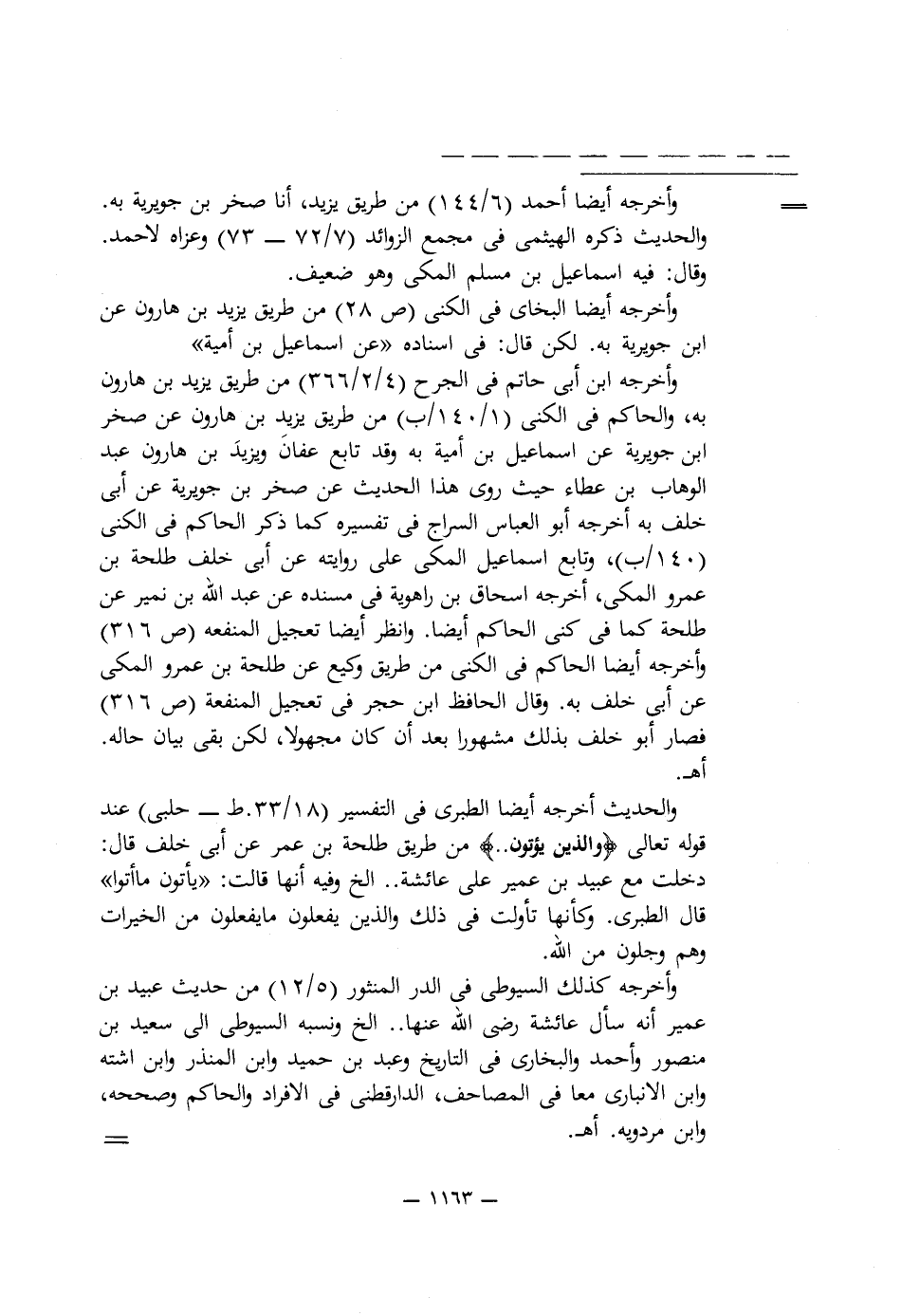 وأخرجه ابن أبى حاتم في الجرح (4/ 2/ 366) من طريق يزيد بن هارون به، والحاكم في الكنى (1/ 140/ ب) من طريق يزيد بن هارون عن صخر ابن جويرية عن إسماعيل بن أمية به وقد تابع عفانَ ويزيدَ بن هارون عبد الوهاب بن عطاء حيث روى هذا الحديث عن صخر بن جويرية عن أبى خلف به أخرجه أبو العباس السراج في تفسيره كما ذكر الحاكم في الكنى (140/ ب)، وتابع إسماعيل المكى على روايته عن أبى خلف طلحة بن عمرو المكى، أخرجه إسحاق بن راهوية في مسنده عن عبد اللَّه بن نمير عن طلحة كما في كنى الحاكم أيضًا. وانظر أيضًا تعجيل المنفعة (ص 316) وأخرجه أيضًا الحاكم في الكنى من طريق وكيع عن طلحة بن عمرو المكى عن أبى خلف به. وقال الحافظ ابن حجر في تعجيل المنفعة (ص 316) فصار أبو خلف بذلك مشهورا بعد أن كان مجهولا، لكن بقى بيان حاله. أهـ.