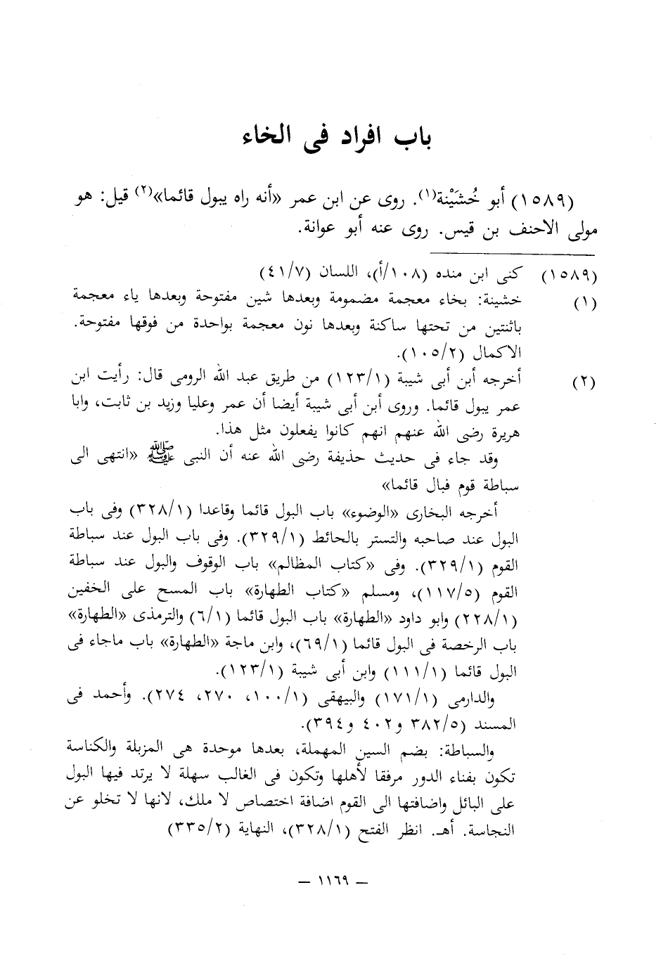 1589 - أبو خُشَيْنة (¬1). روى عن ابن عمر "أنه راه يبول قائما" (¬2) قيل: هو مولى الأحنف بن قيس. روى عنه أبو عوانة.