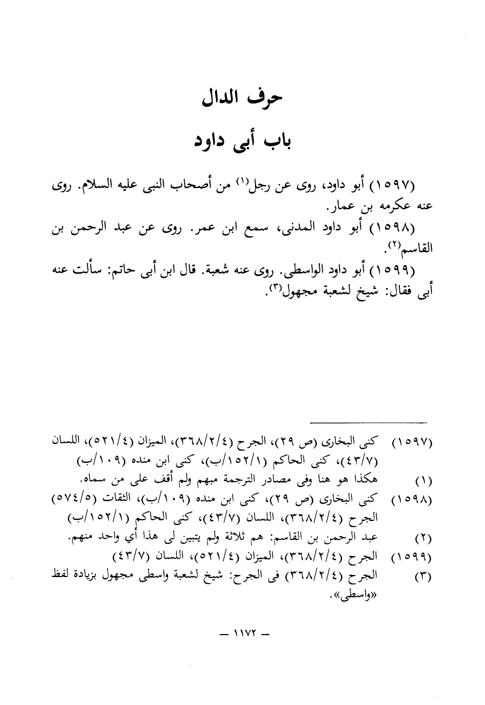 1599 - أبو داود الواسطى. روى عنه شعبة. قال ابن أبى حاتم: سألت عنه أبى فقال: شيخ لشعبة مجهول (¬3).