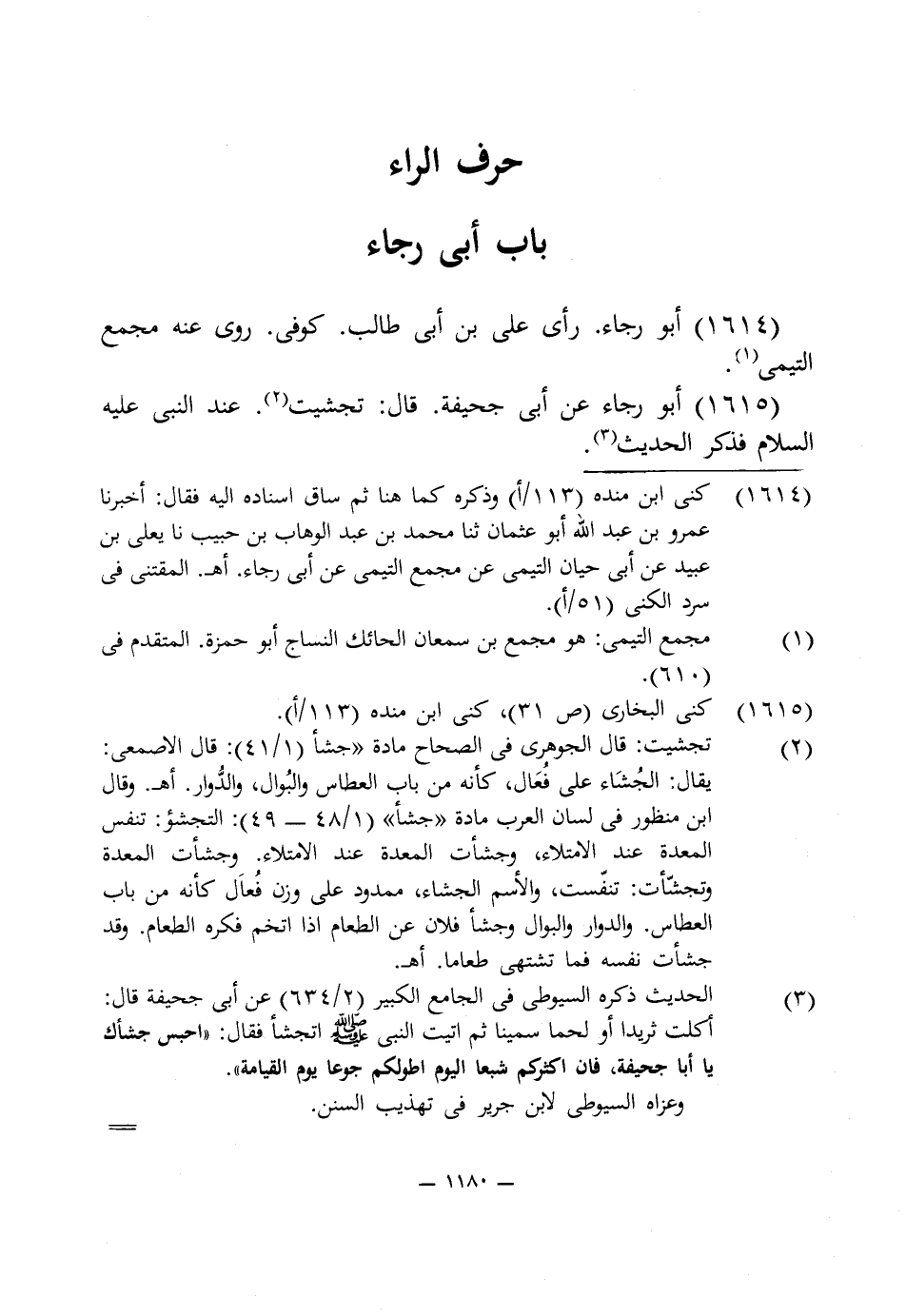 1615 - أبو رجاء عن أبى جحيفة. قال: تجشيت (¬2). عند النبى عليه السلام فذكر الحديث (¬3).